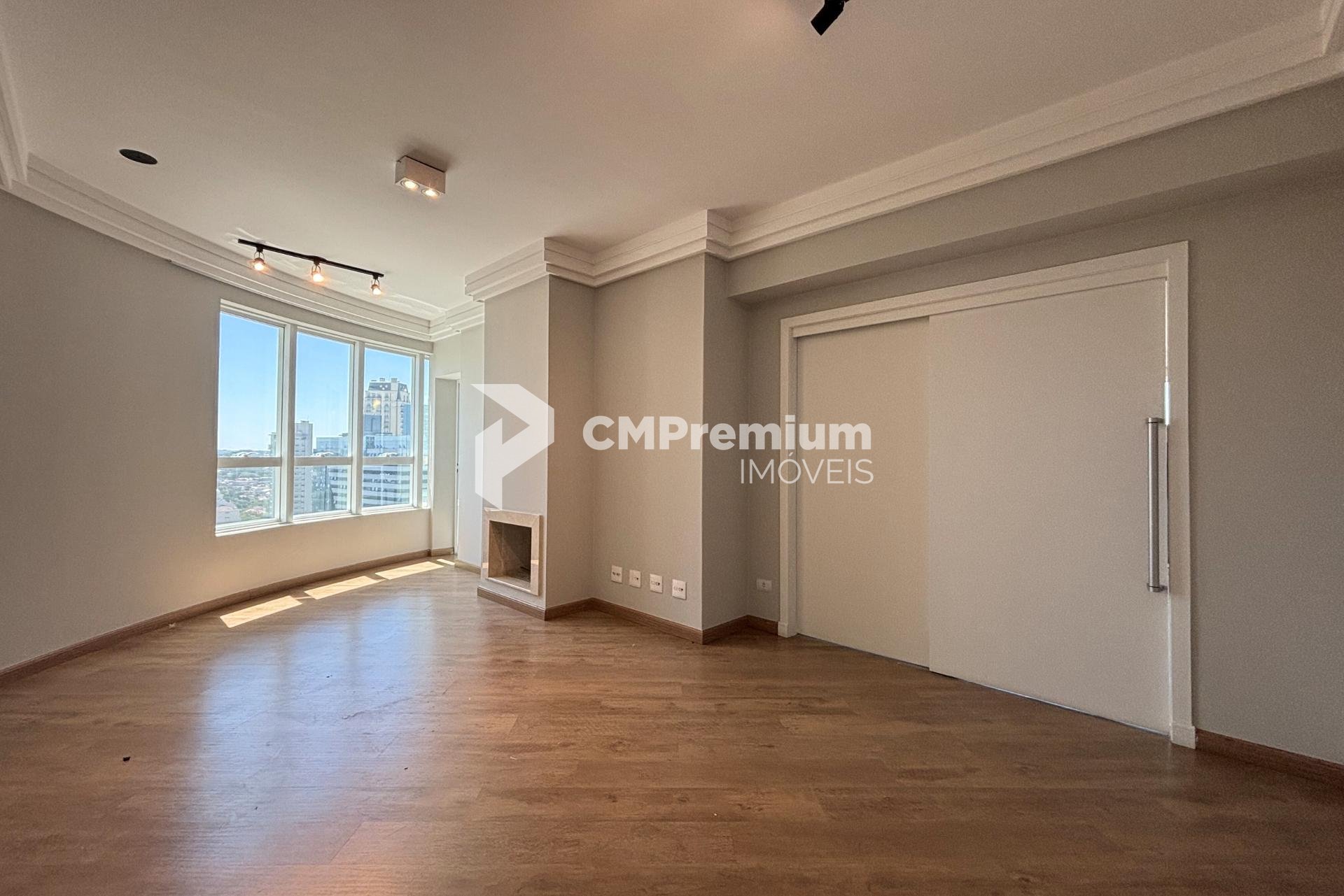 * Ampla sala de estar com rack e esquadrias do teto ao chão, proporcionando excelente iluminação natural e vista para o Ecoville