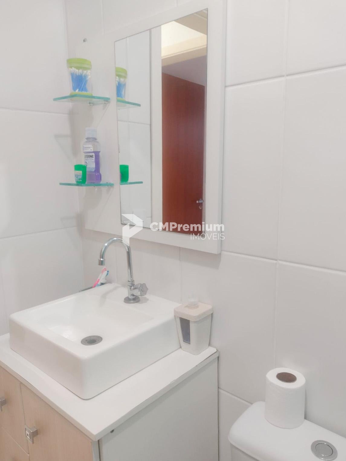 Banheiro completo com box de vidro, armário, espelheira e prateleiras.