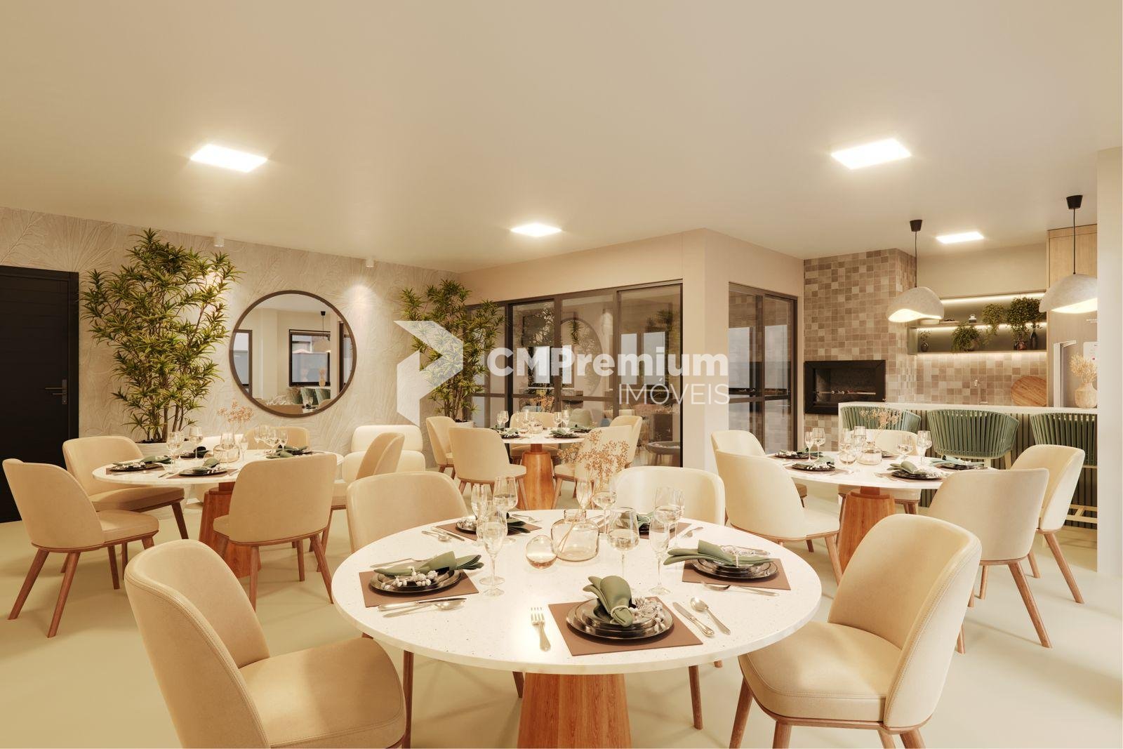 O salão de festas está pronto para suas celebrações.