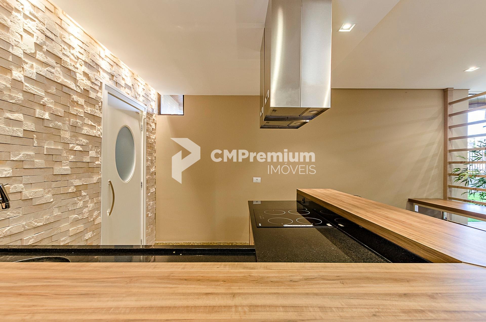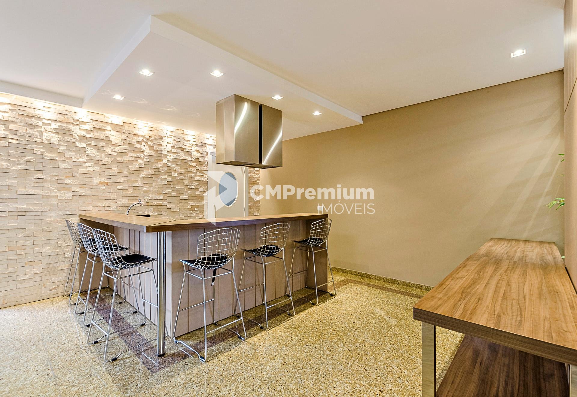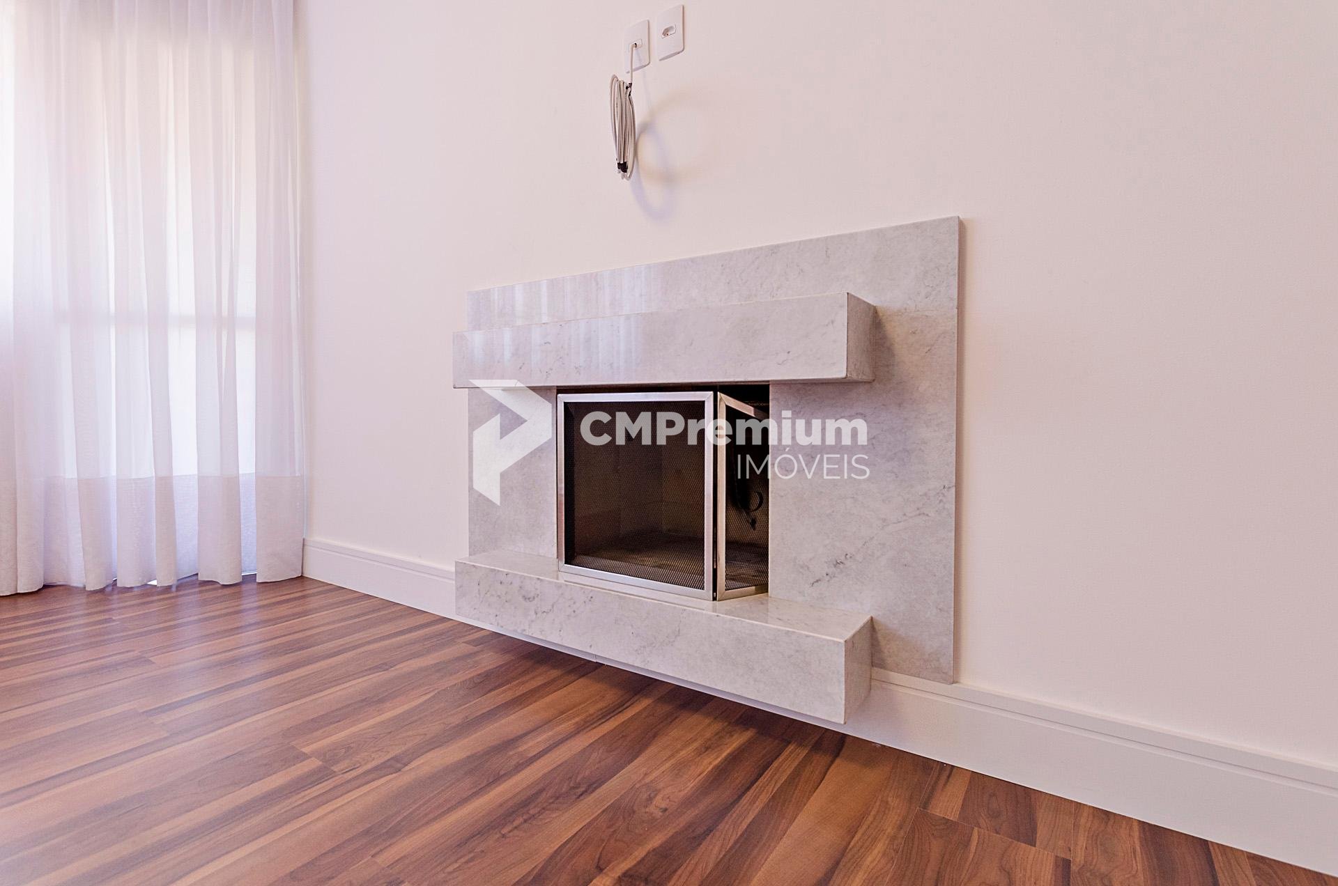 Sala de estar com lareira e acesso a sacada, integrada com a copa e a churrasqueira a carvão, com piso em granito.