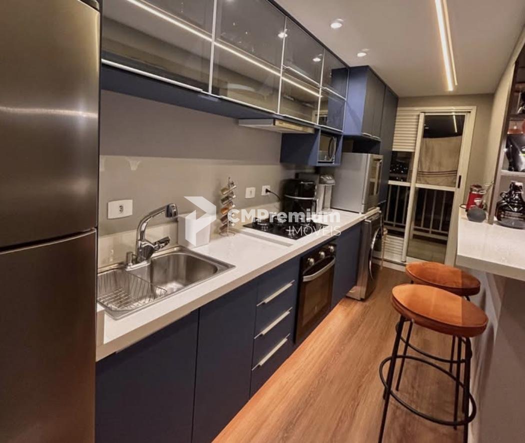 A cozinha planejada estilo gourmet possui excelente aproveitamento de espaço, bancada tipo bar, armários sob medida e lavanderia integrada.