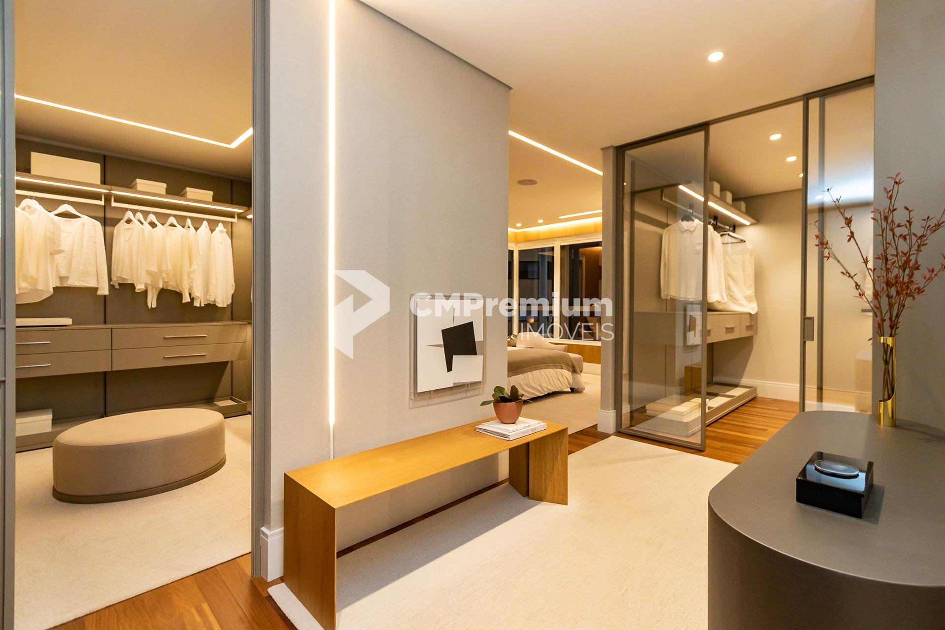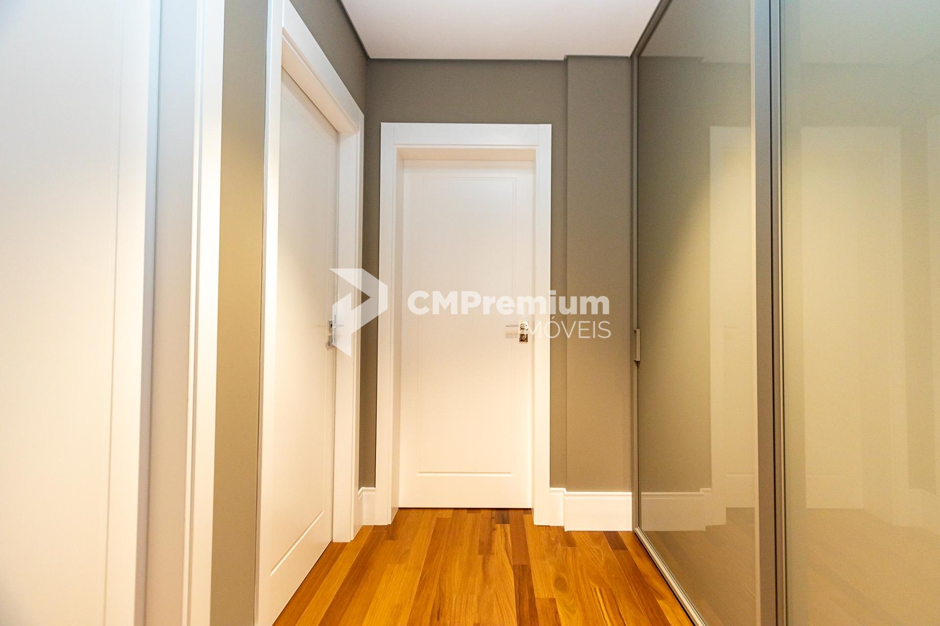 Piso em madeira natural estruturada na circulação e suítes