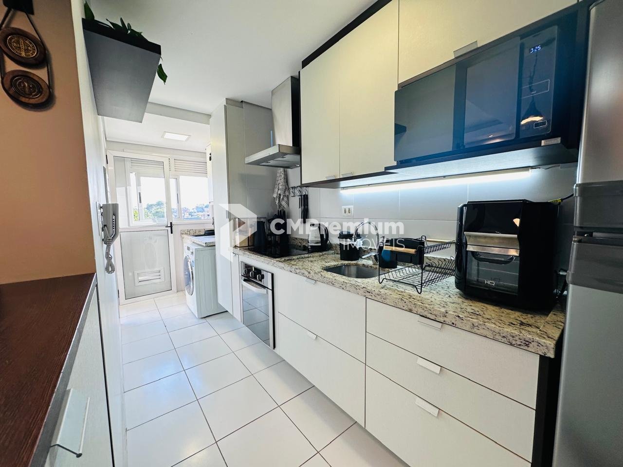 A cozinha é funcional e integrada à área de serviço, tornando o espaço mais prático para as atividades do dia a dia.
