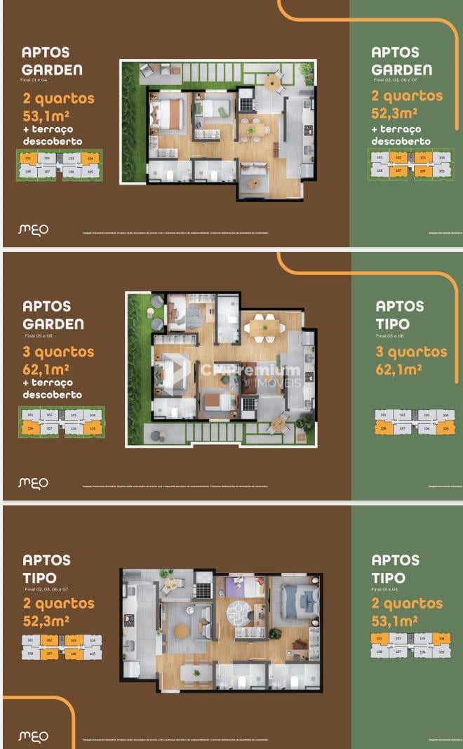 Opções Garden 3 dormitórios tendo 62,09 m² privativos