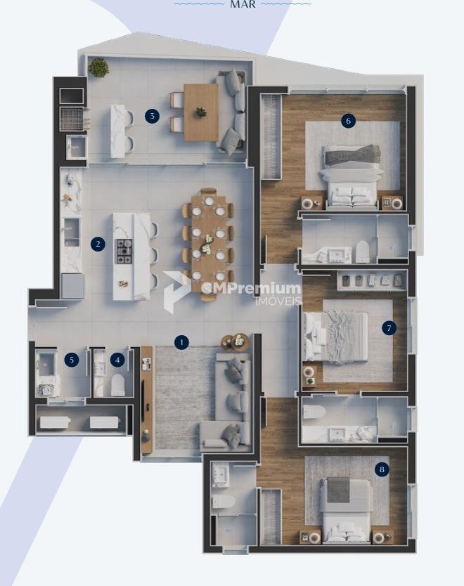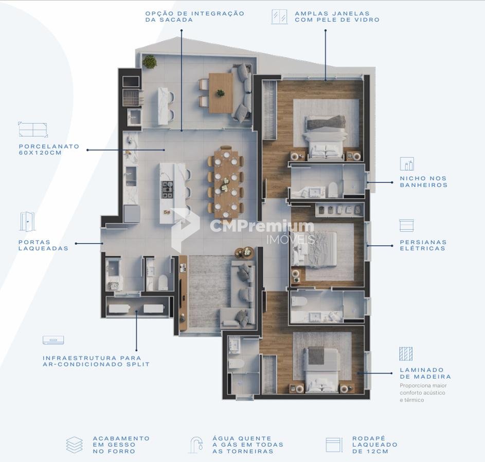 * Amplo living integrado (estar/jantar/cozinha) com opção de integração da sacada