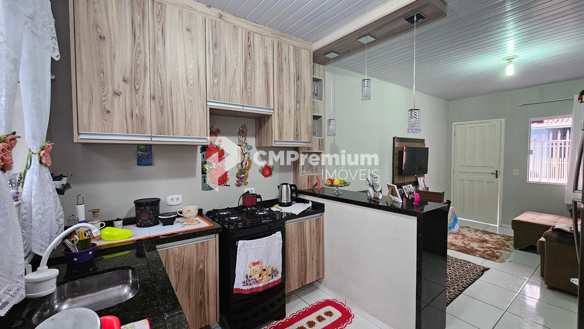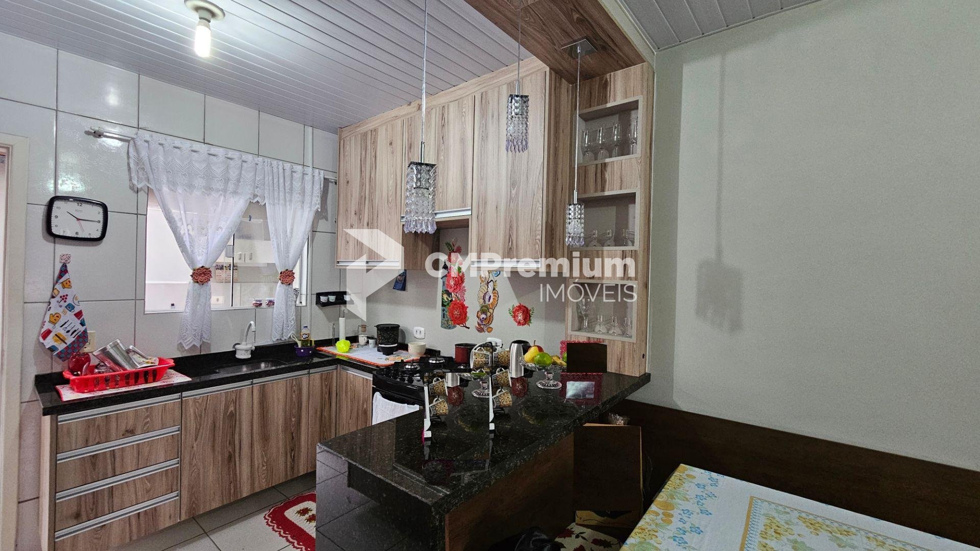 Cozinha com armários planejados em excelente estado e bancada em granito que integra sala e cozinha, garantindo praticidade e sofisticação.