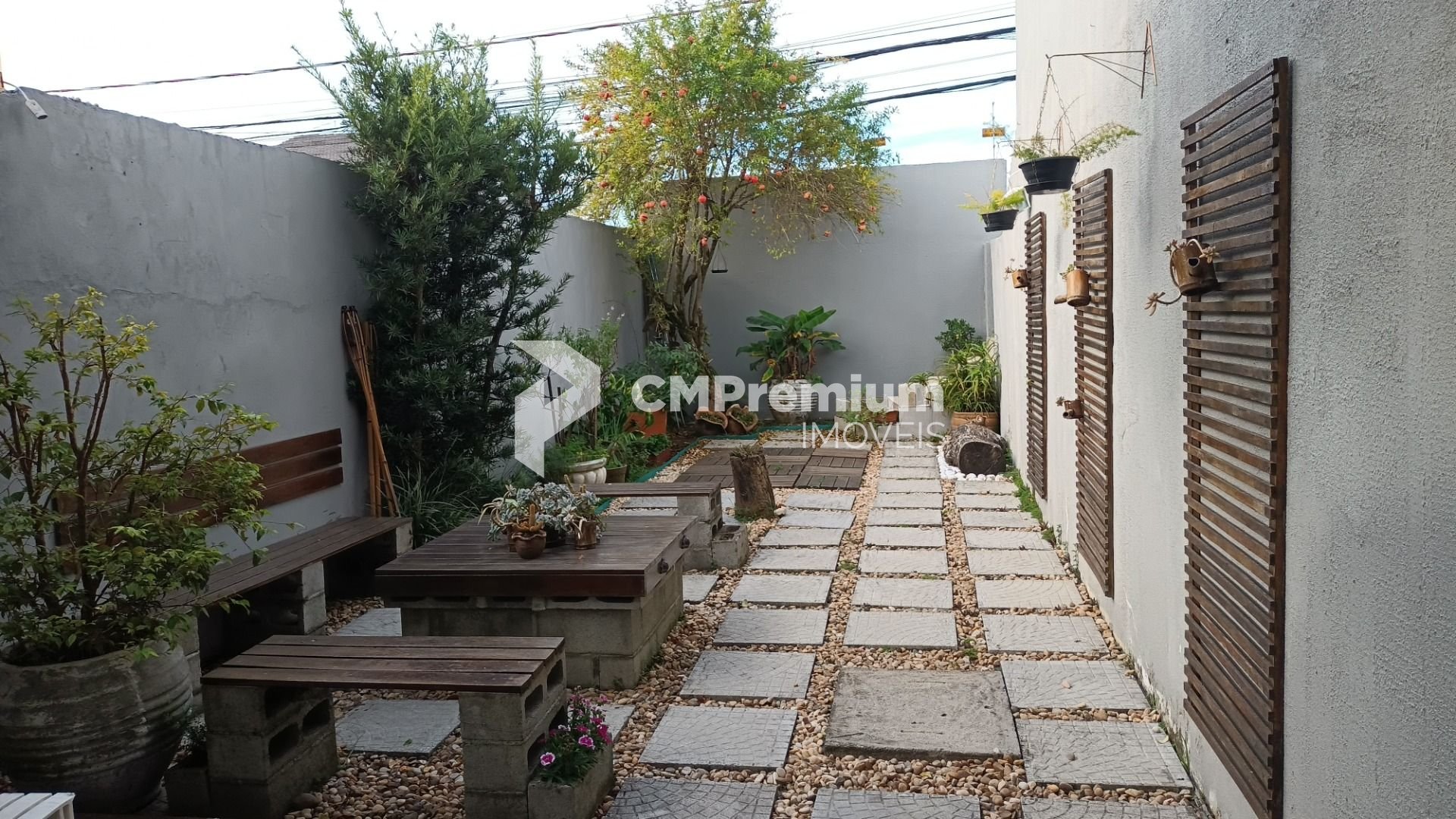 Jardim encantador com uma charmosa lareira de chão.