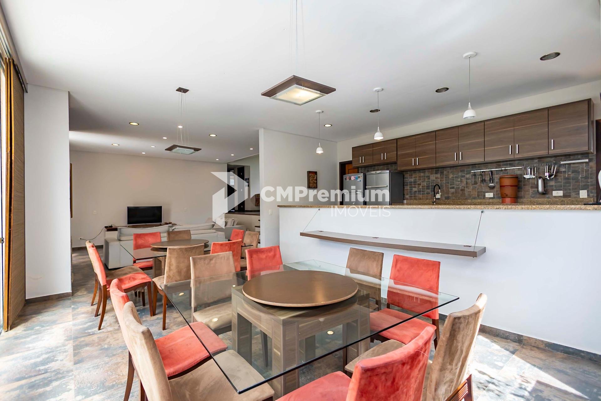 Com 573,93 m² privativos em dois terrenos unificados, a propriedade impressiona pelo espaço e pelo projeto arquitetônico. A área social é integrada, com sala e cozinha conectadas em um ambiente acolhedor, ideal para o dia a dia e para receber com estilo.
