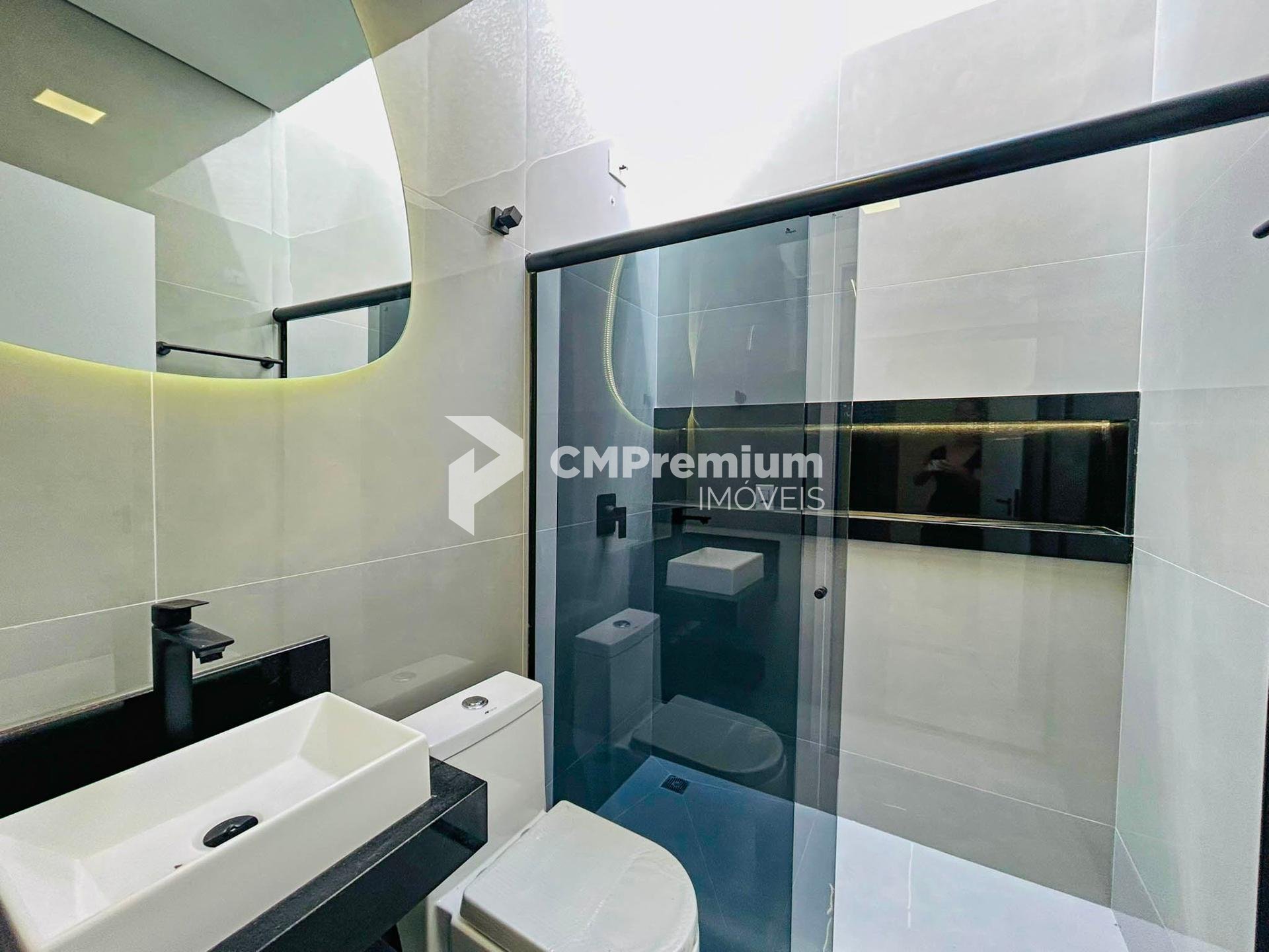 Banheiros completos, com box, nicho em mármore, pia e espelho