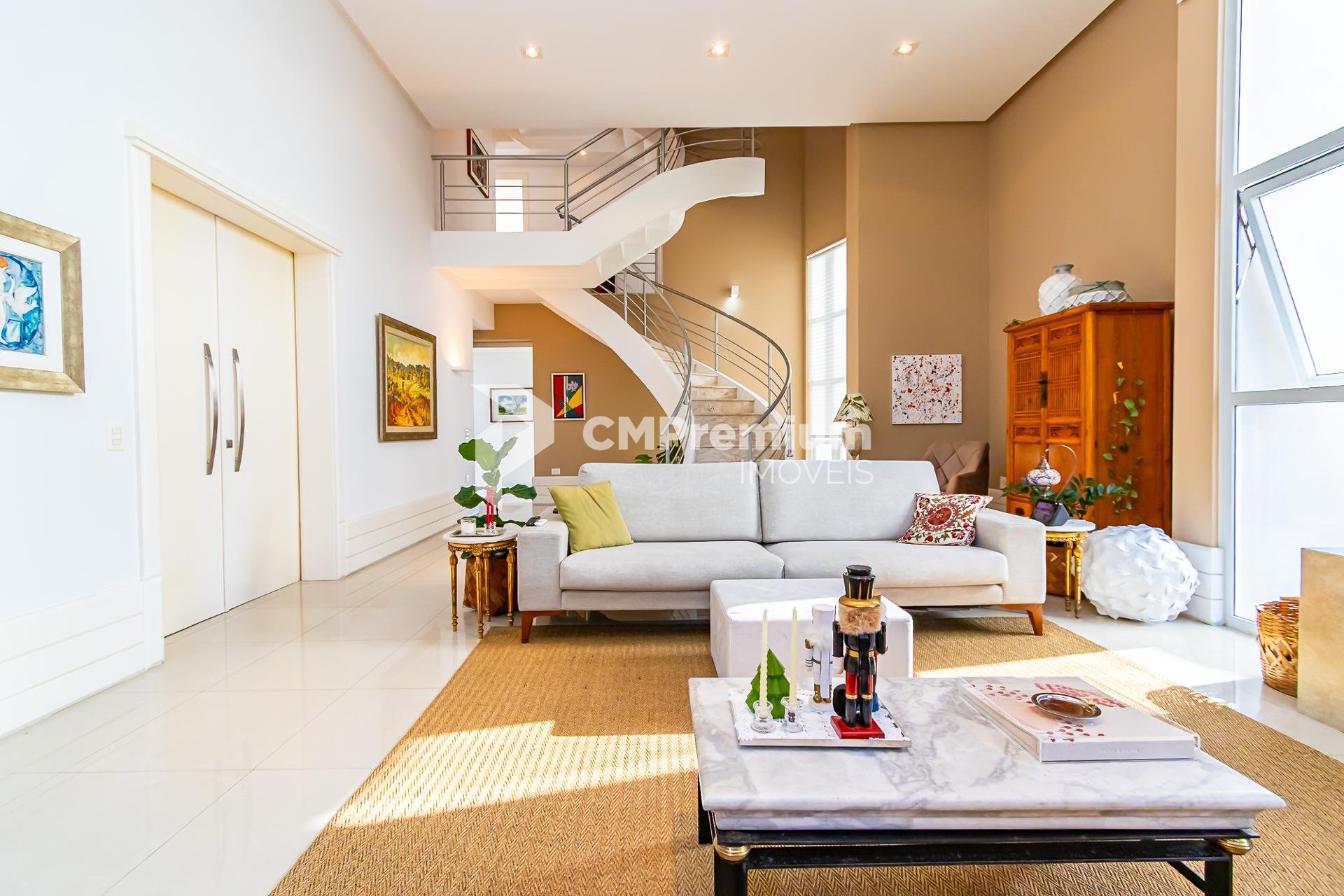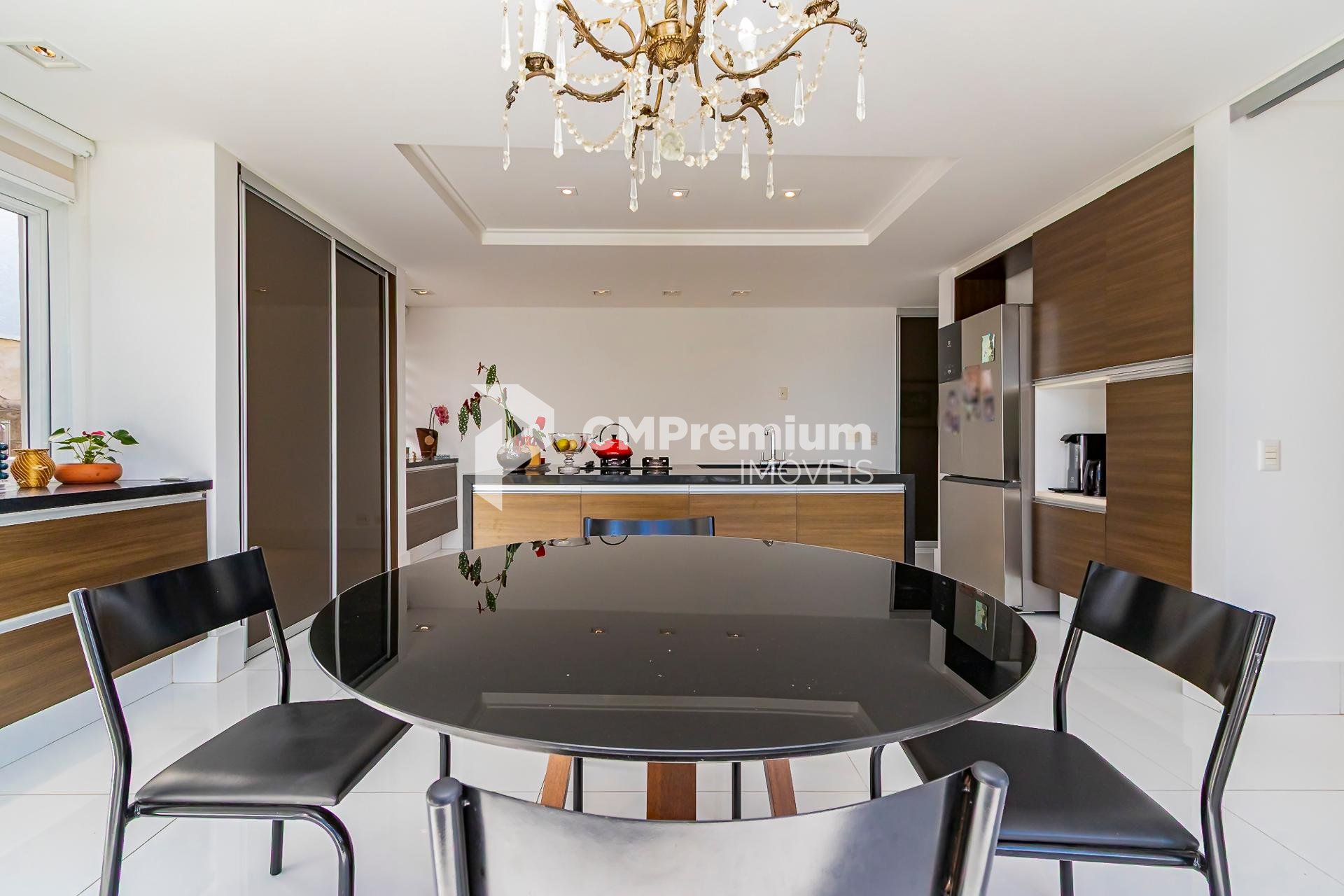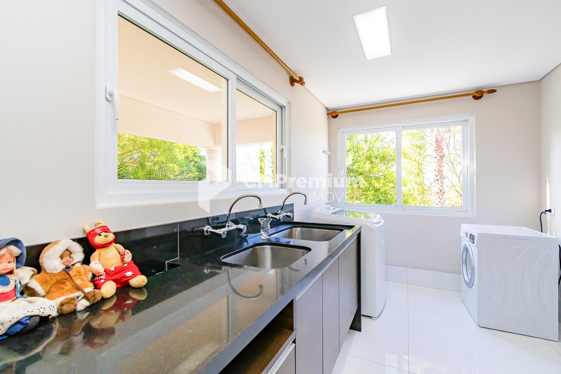No pavimento térreo, o destaque fica para a sala de estar com pé-direito duplo, janelas amplas e muita luz natural. A lareira complementa o ambiente, criando um clima acolhedor nos dias mais frios. A cozinha gourmet planejada, moderna e funcional, se conecta à área de serviços espaçosa e ventilada, garantindo praticidade no dia a dia. E que vista tem essa cozinha!
