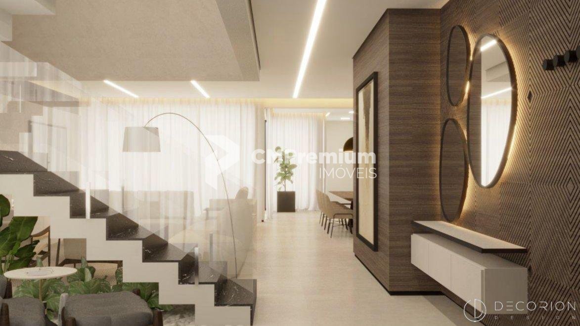 Arquitetura moderna, com pé-direito duplo e iluminado, valorizando amplitude e integração dos ambientes.