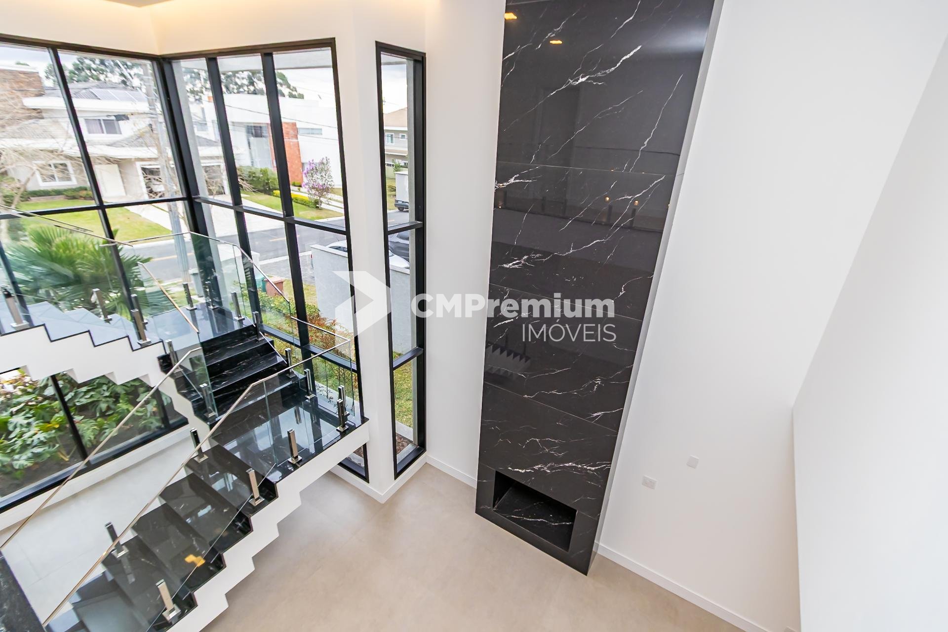 Sala com lareira e escadaria em mármore, transmitindo requinte e imponência.