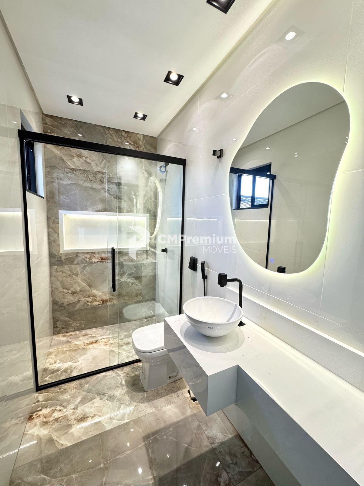 Banheiro social com design moderno, também com pia esculpida, nicho com LED e box