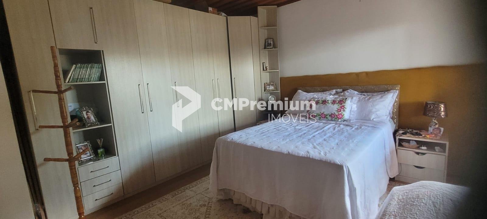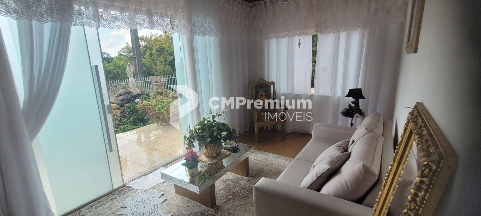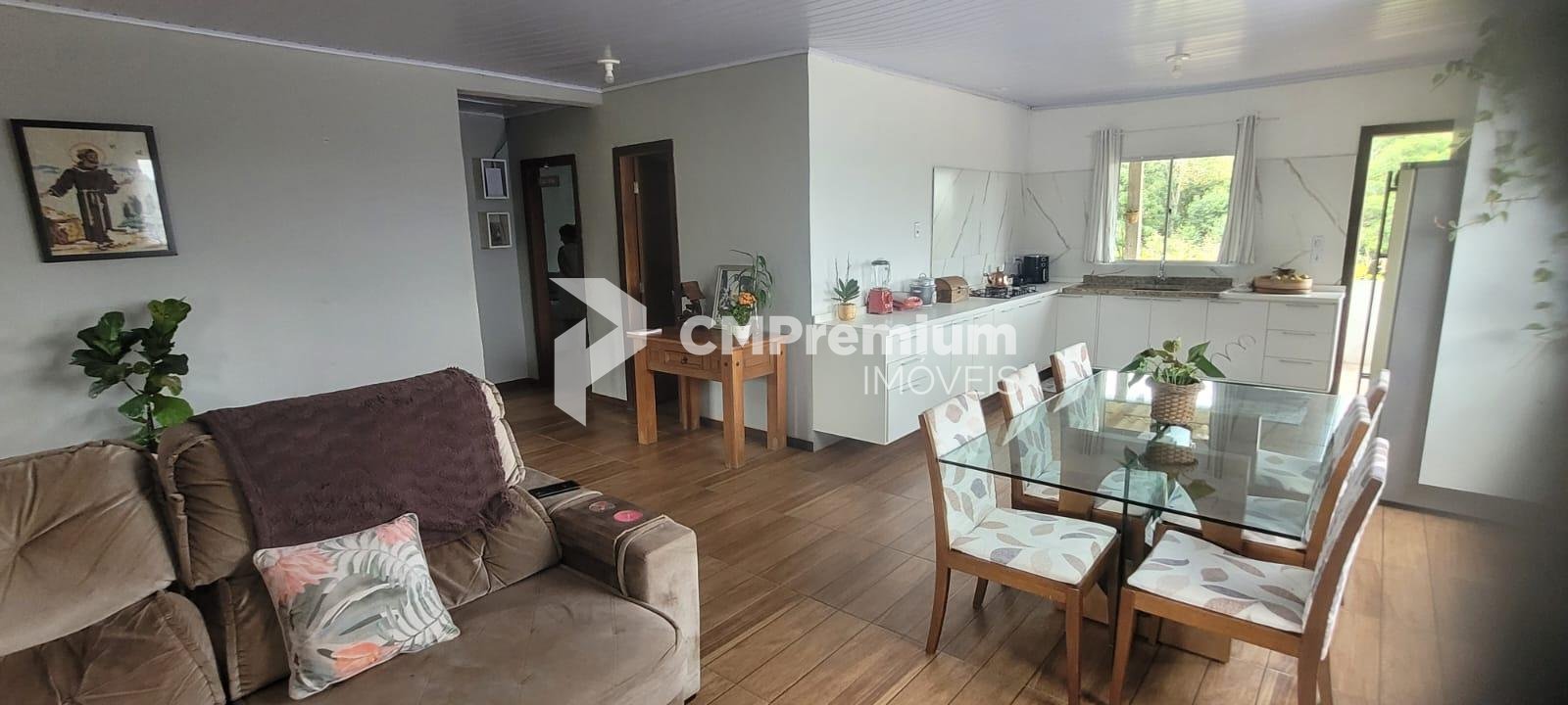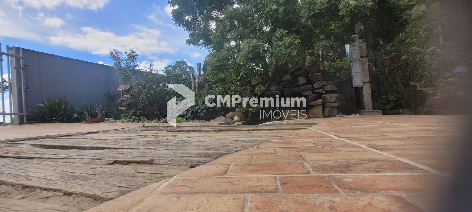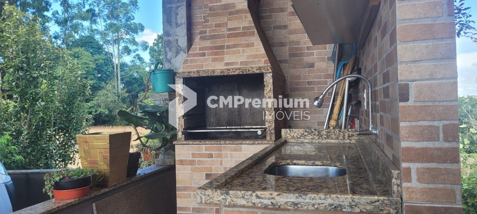 Casa principal com 255 m², 3 quartos (1 suíte), ampla sala, cozinha, 3 banheiros, sótão, varanda, garagem, churrasqueira coberta e área externa com lajotas (207 m²).