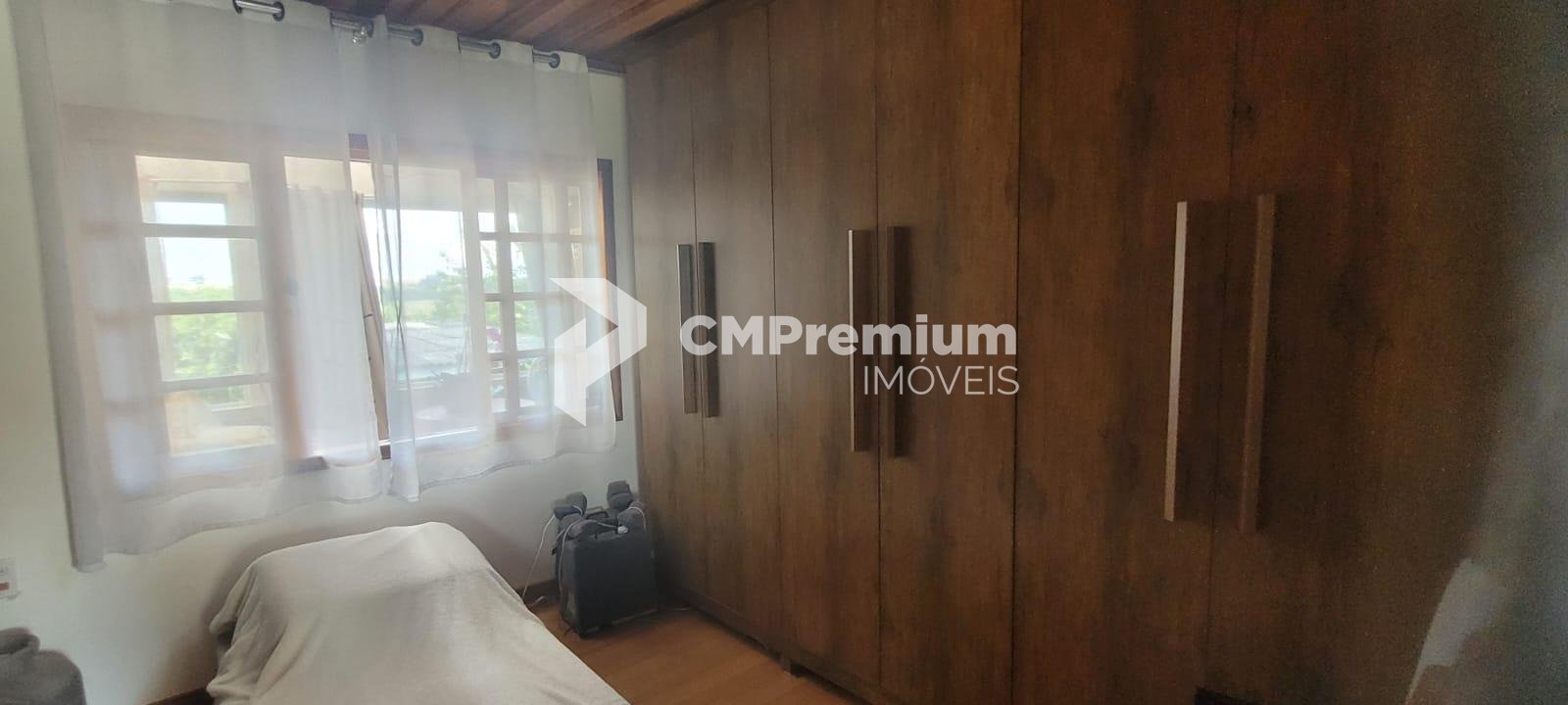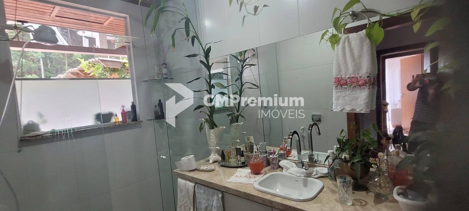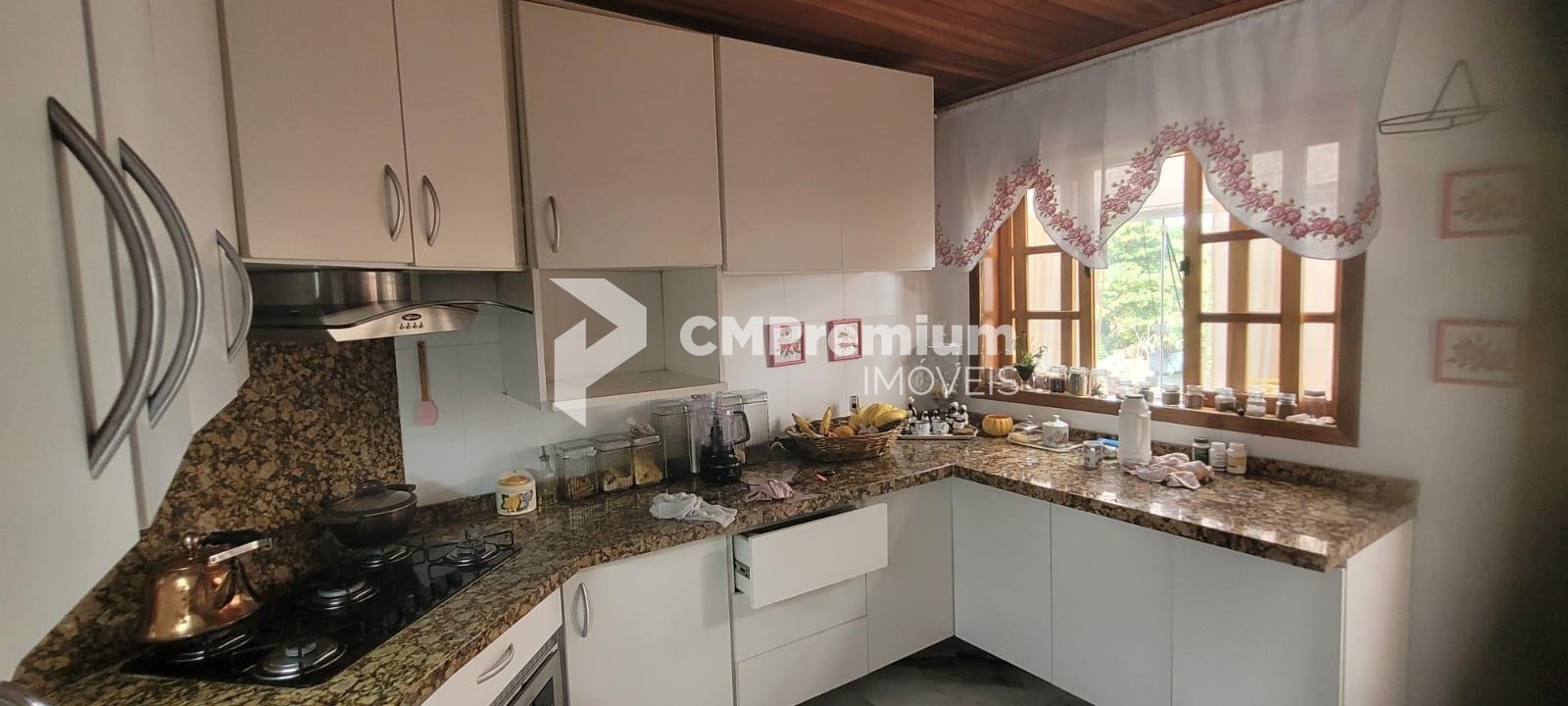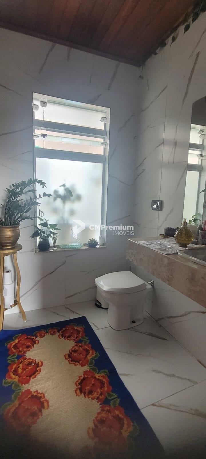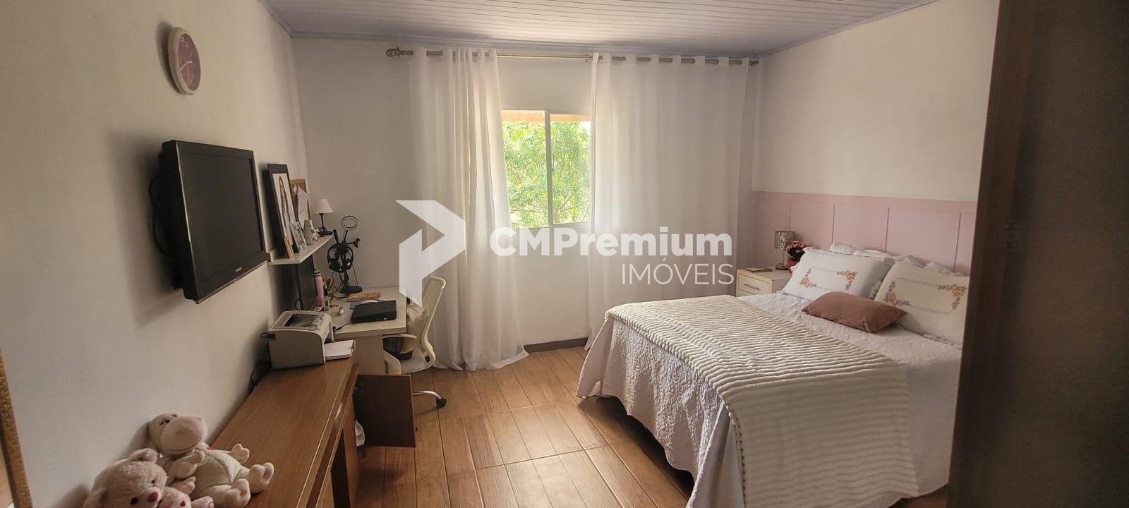 Casa principal com 255 m², 3 quartos (1 suíte), ampla sala, cozinha, 3 banheiros, sótão, varanda, garagem, churrasqueira coberta e área externa com lajotas (207 m²).