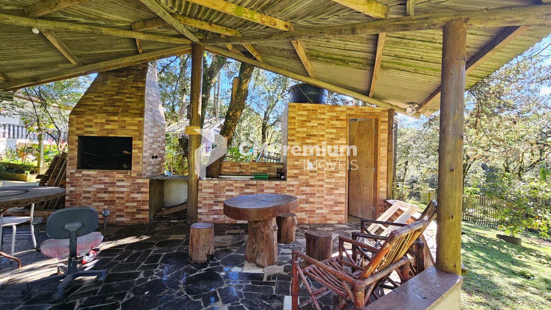 Área externa completa: quiosque com churrasqueira, pia de apoio e lavabo