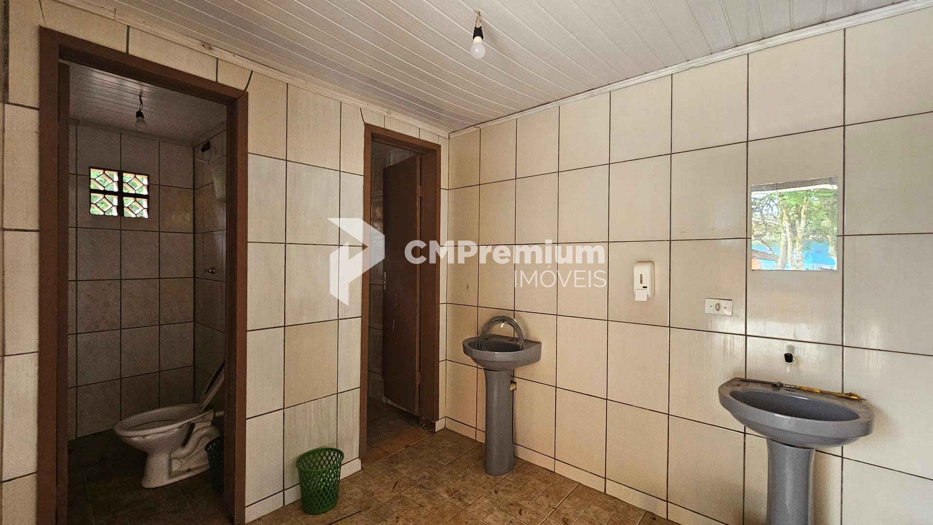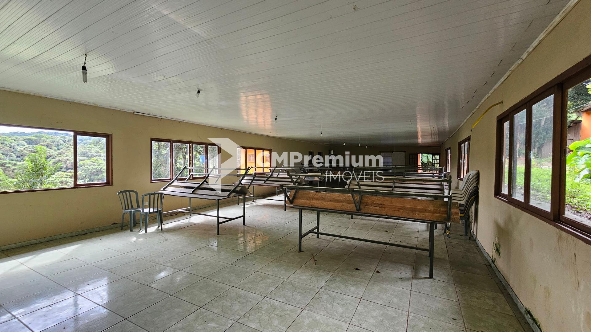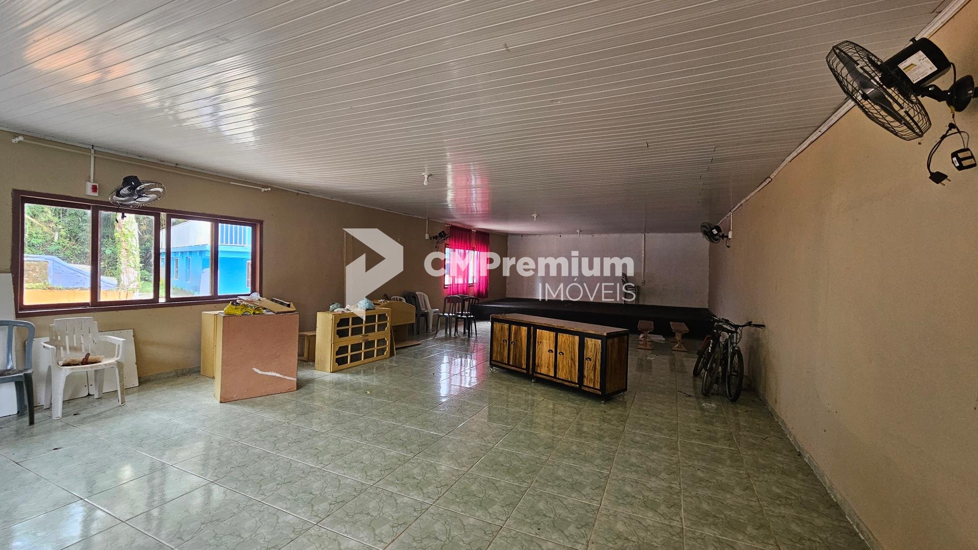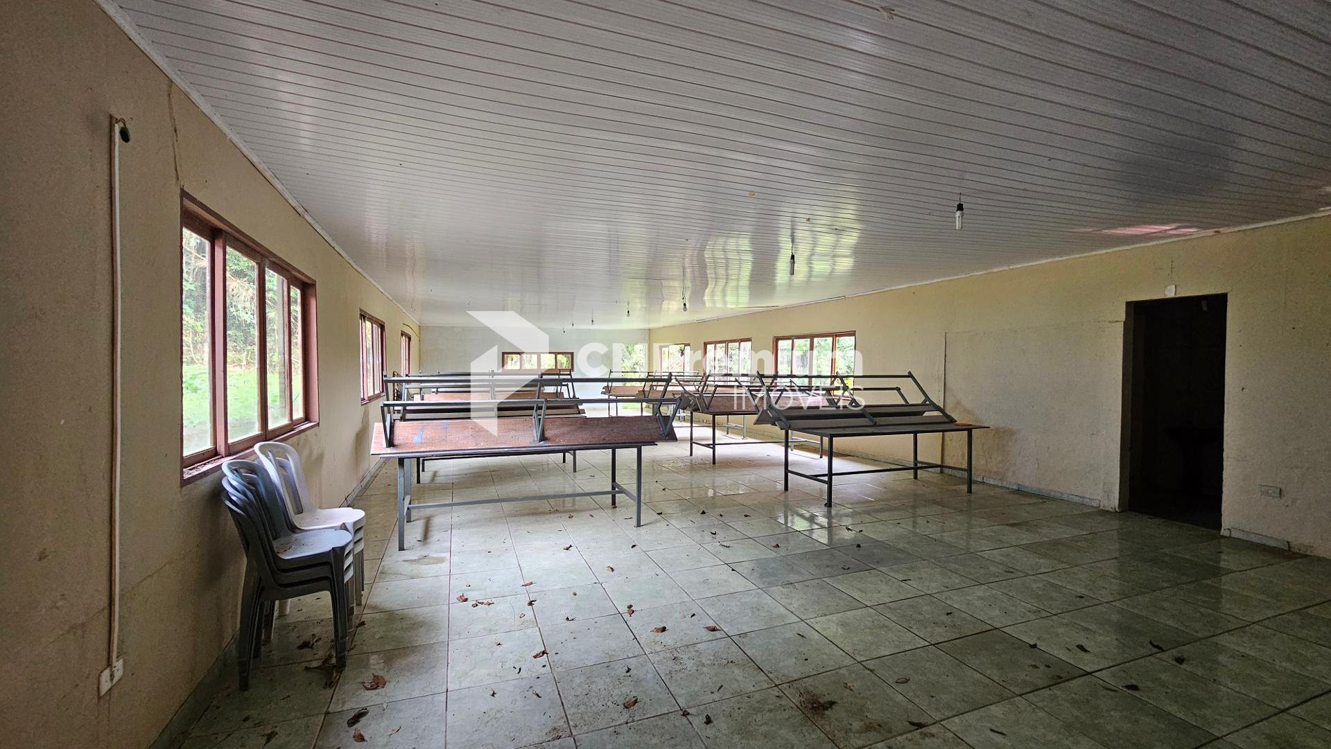 Salão para eventos com espaço coberto e 4 banheiros (2 masculinos e 2 femininos)