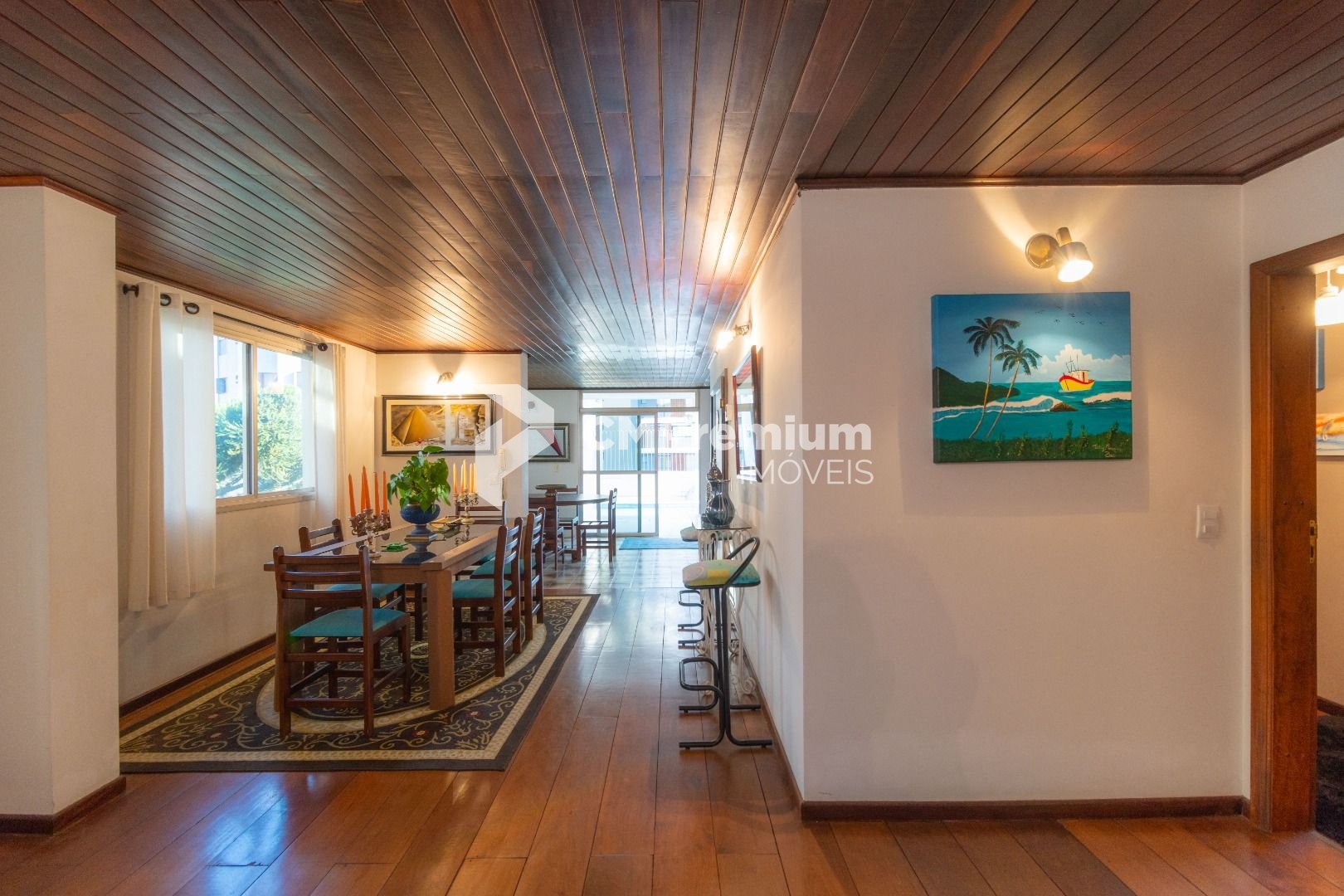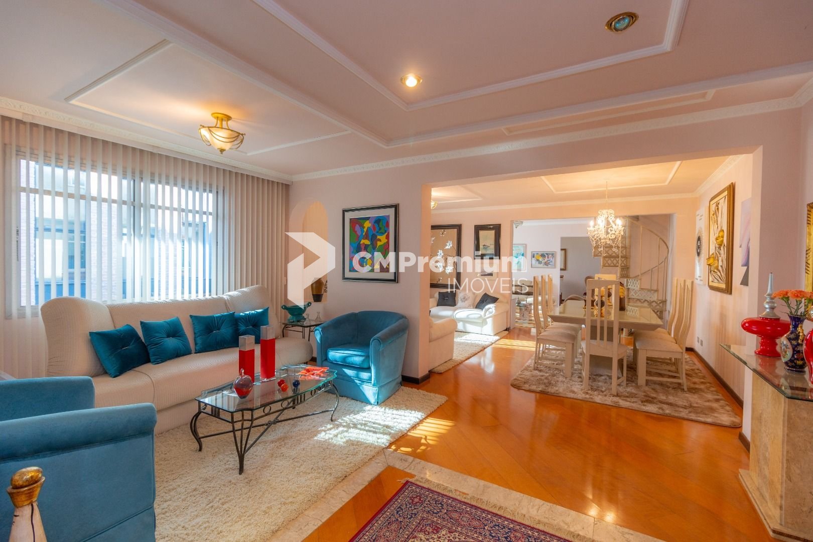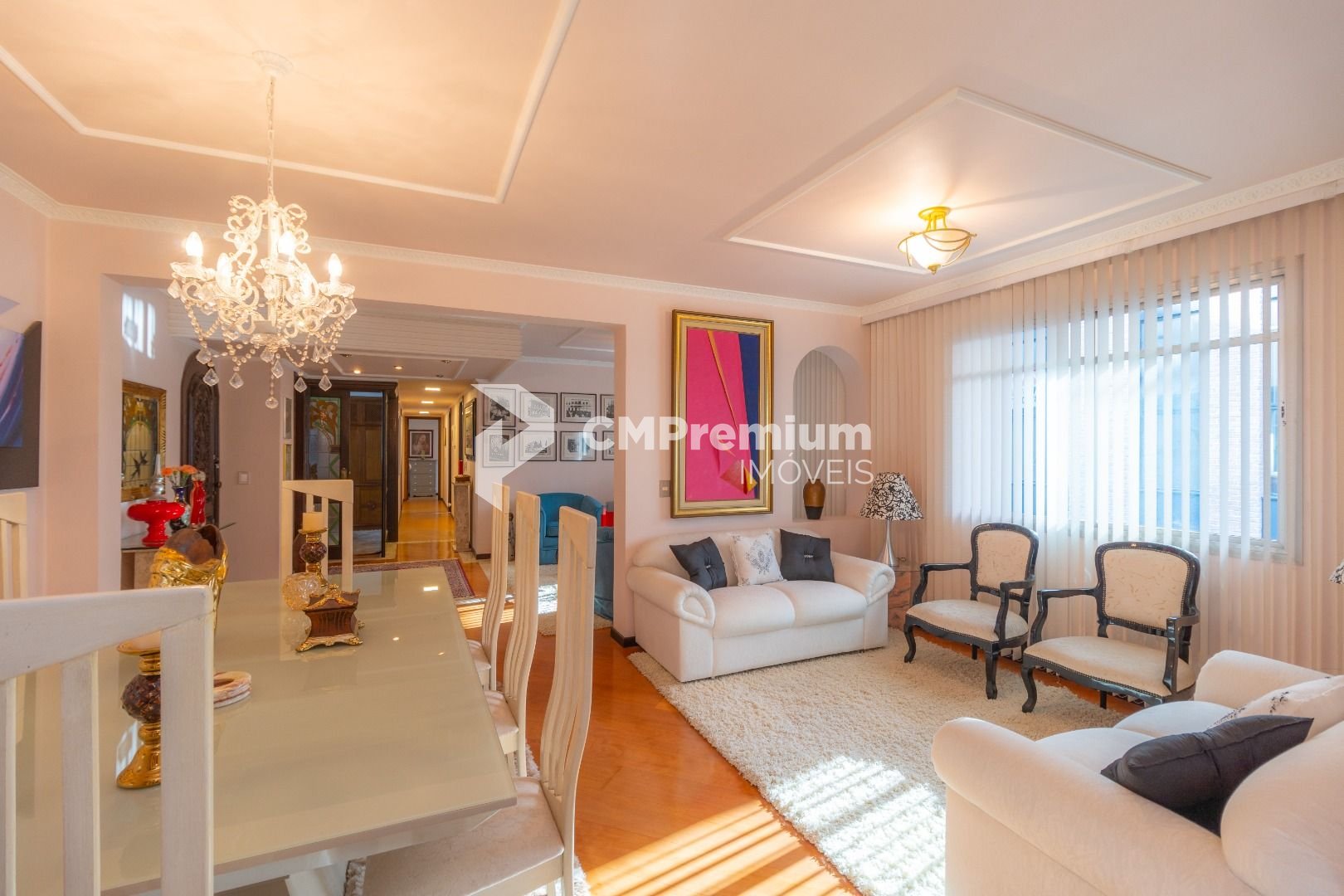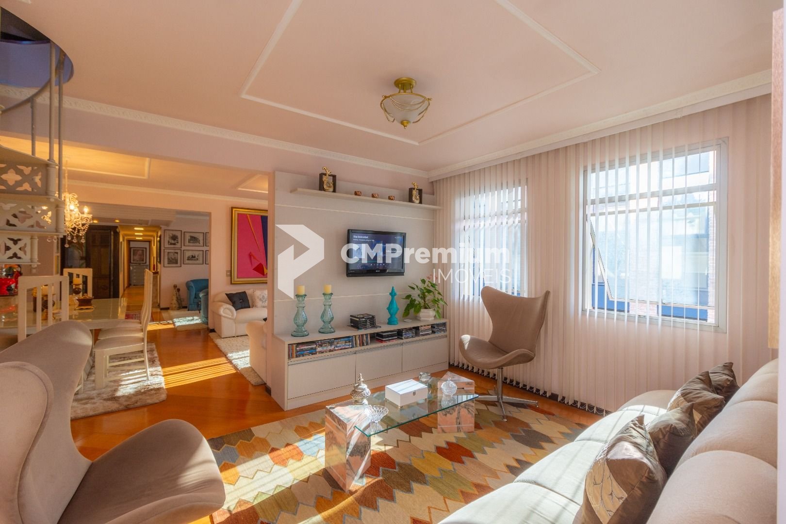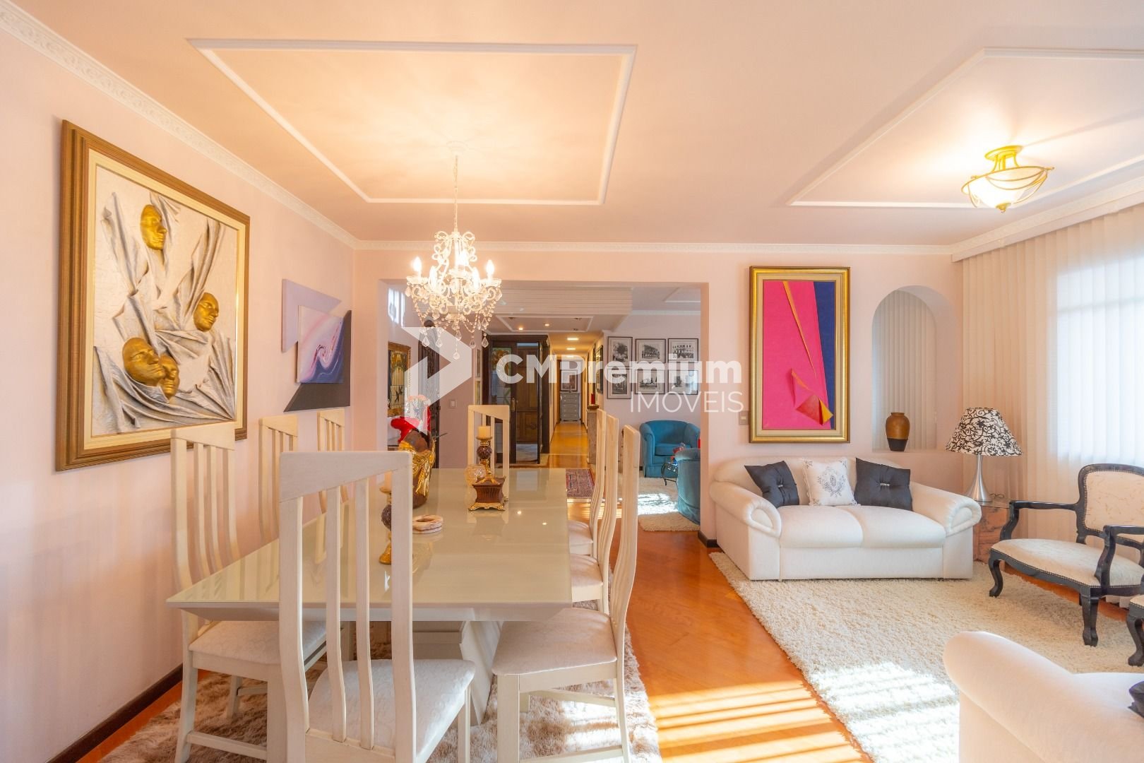 Quatro salas integradas: sala de estar, sala de TV, sala de jantar e copa ao lado da cozinha.