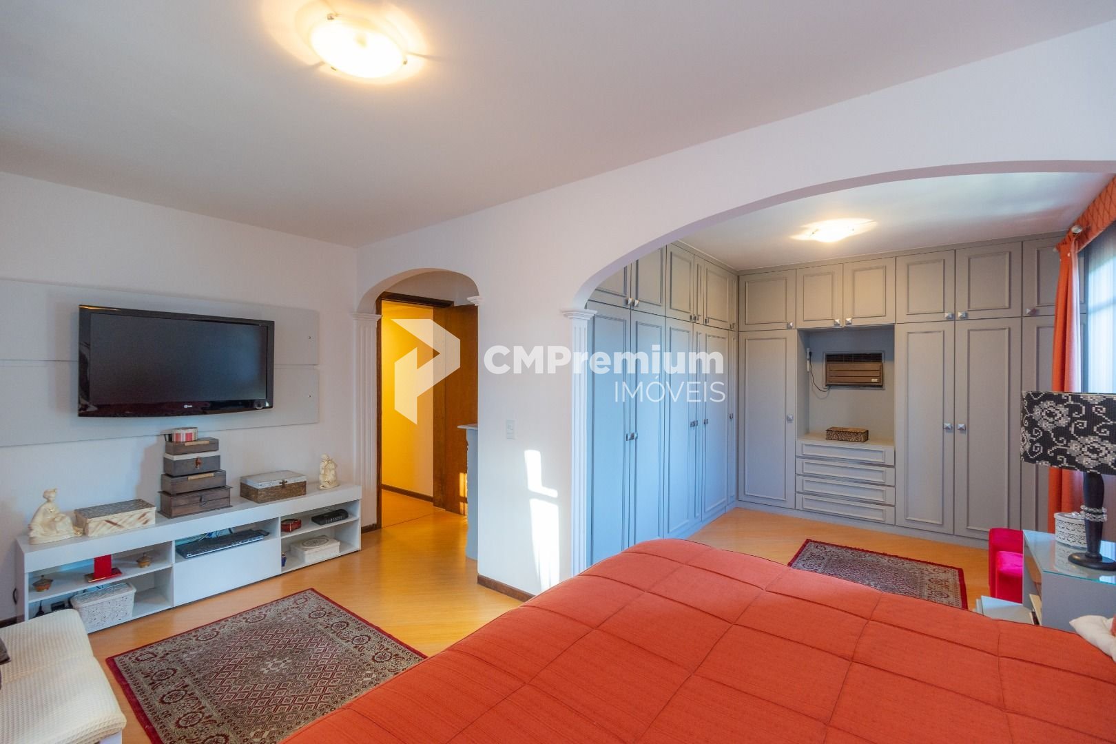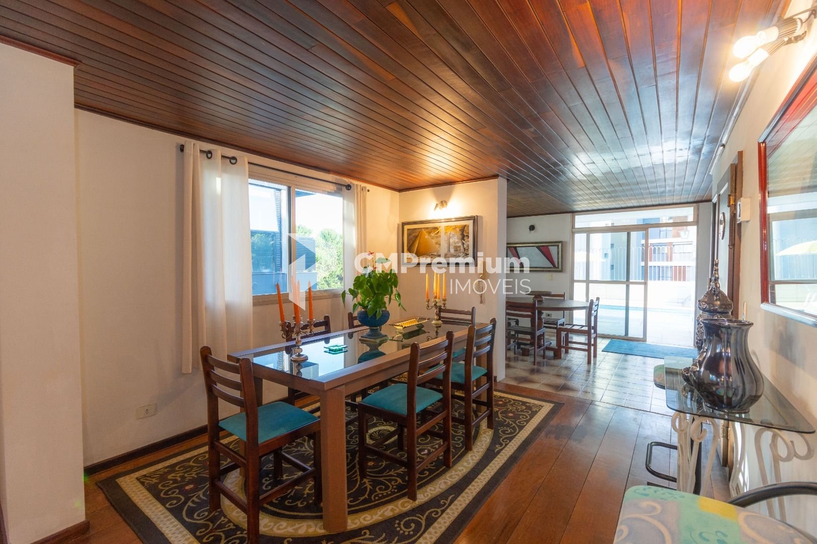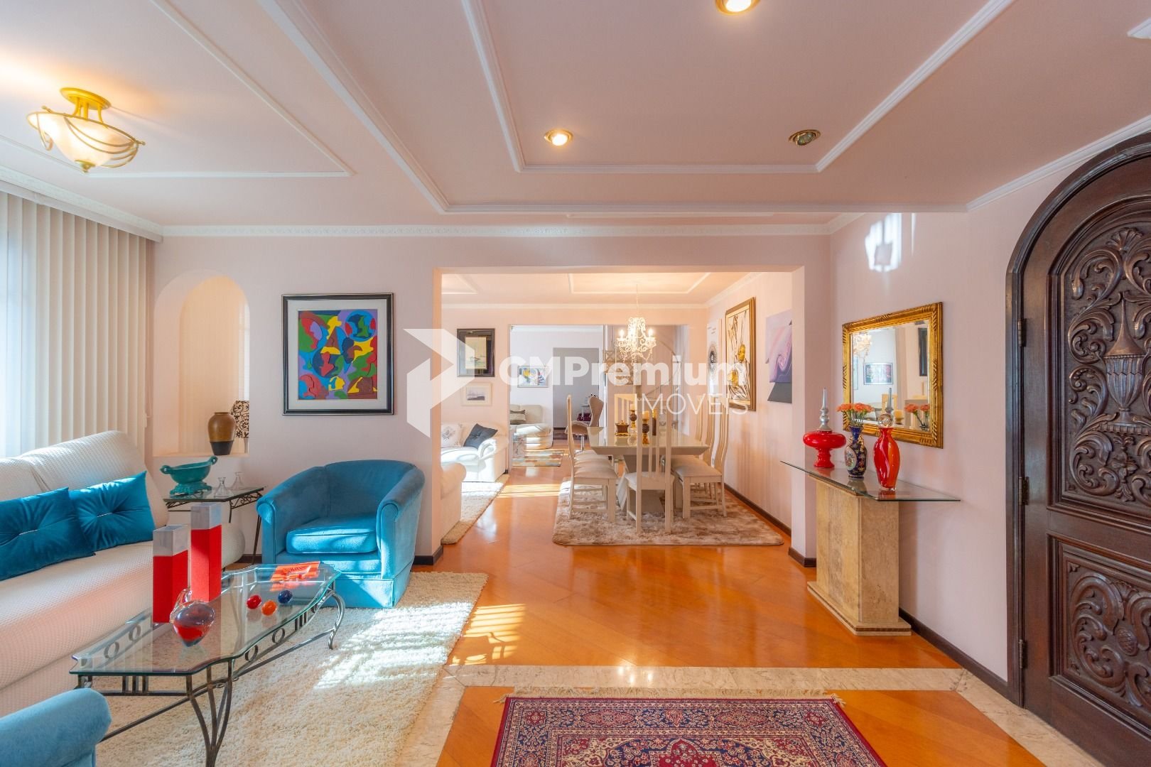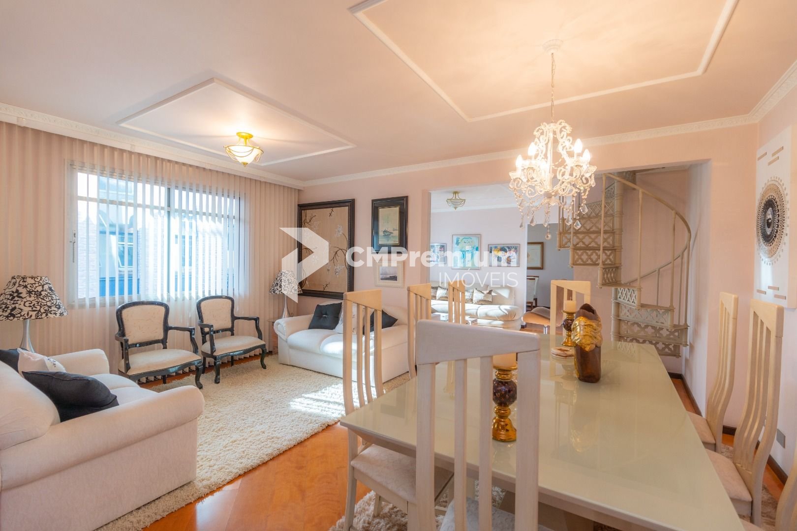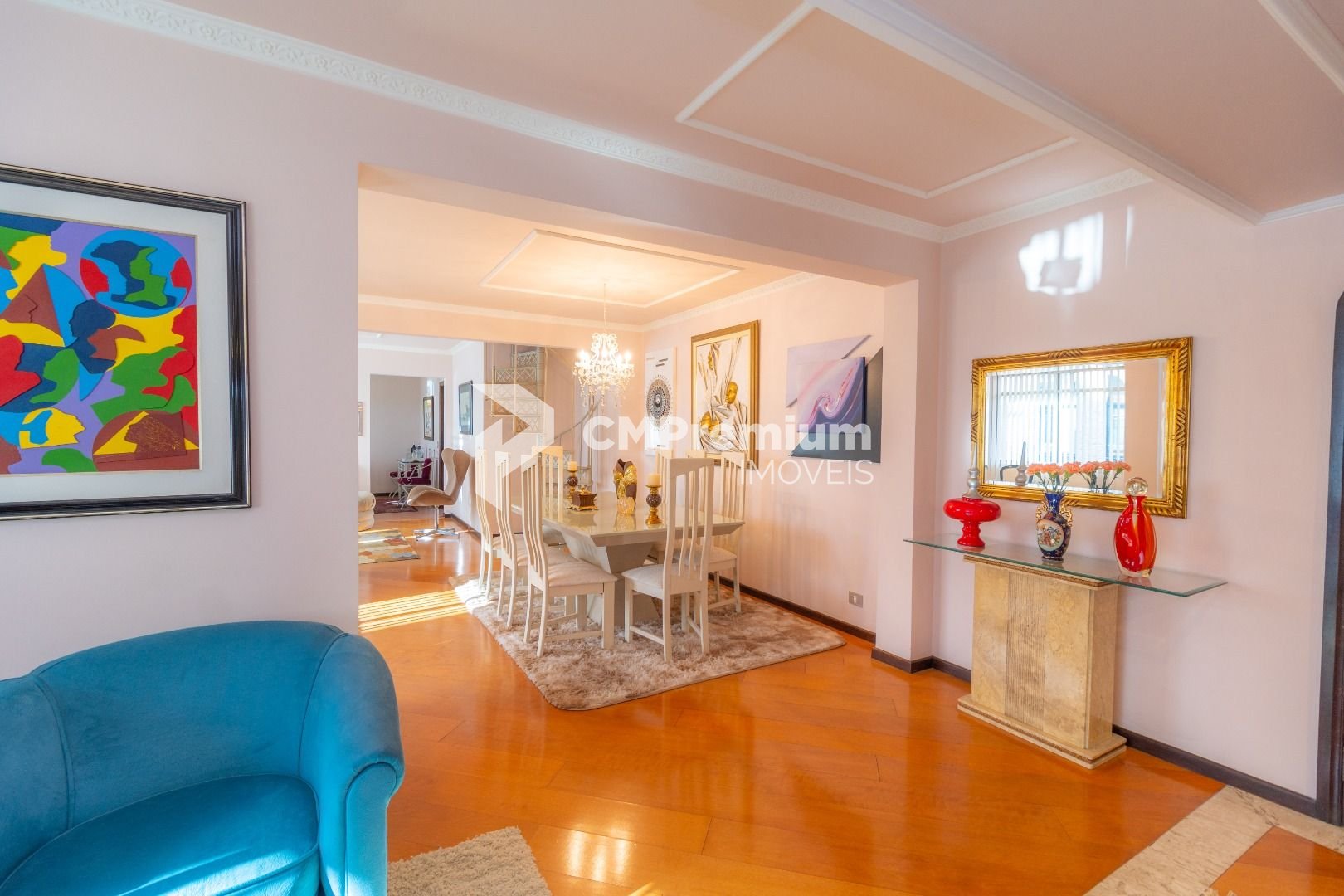 Quatro salas integradas: sala de estar, sala de TV, sala de jantar e copa ao lado da cozinha.