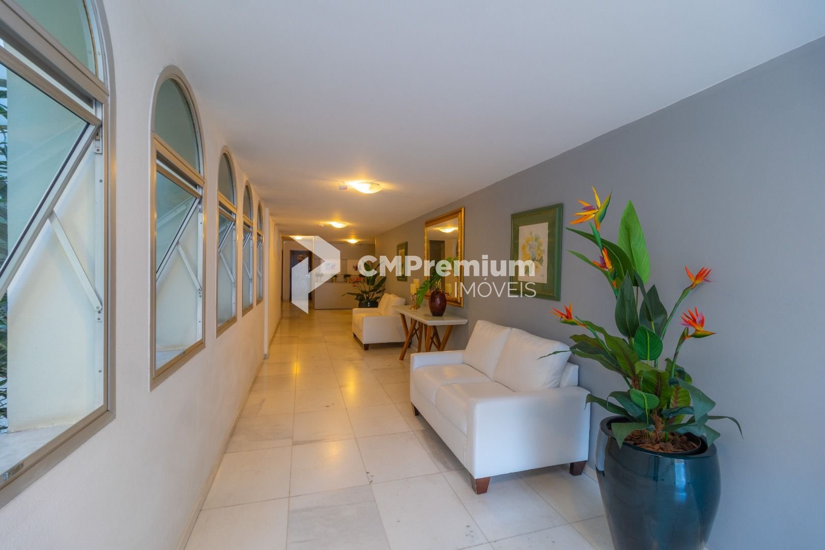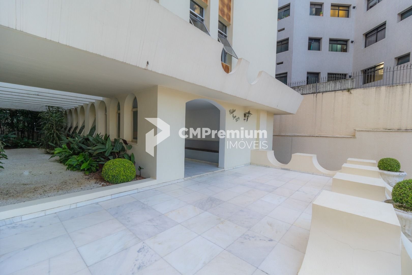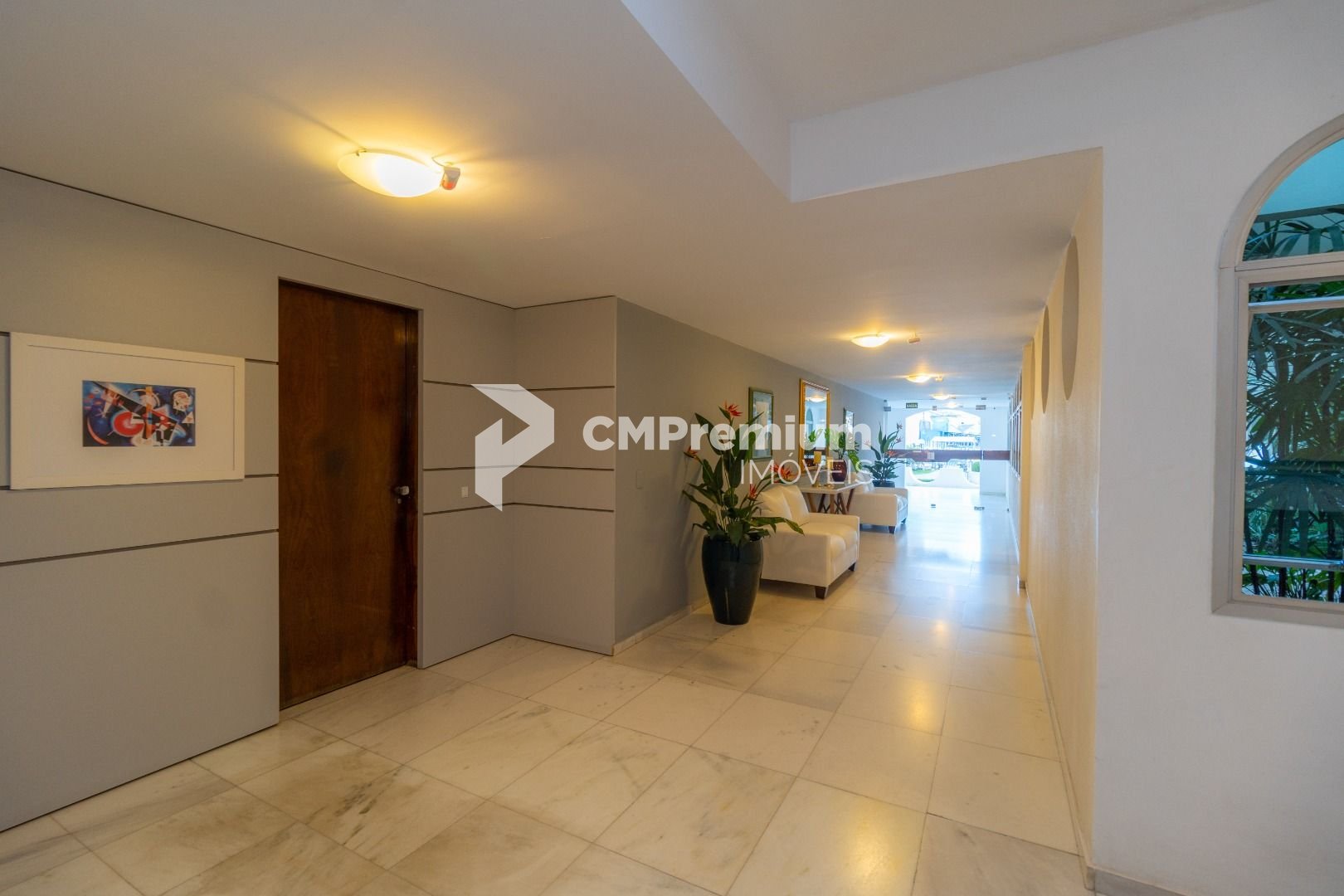 Salão de festas e jardim no piso térreo, com hall de entrada em mármore branco.