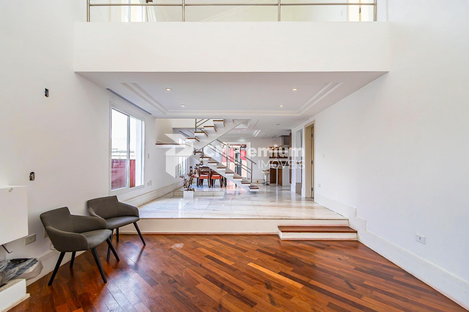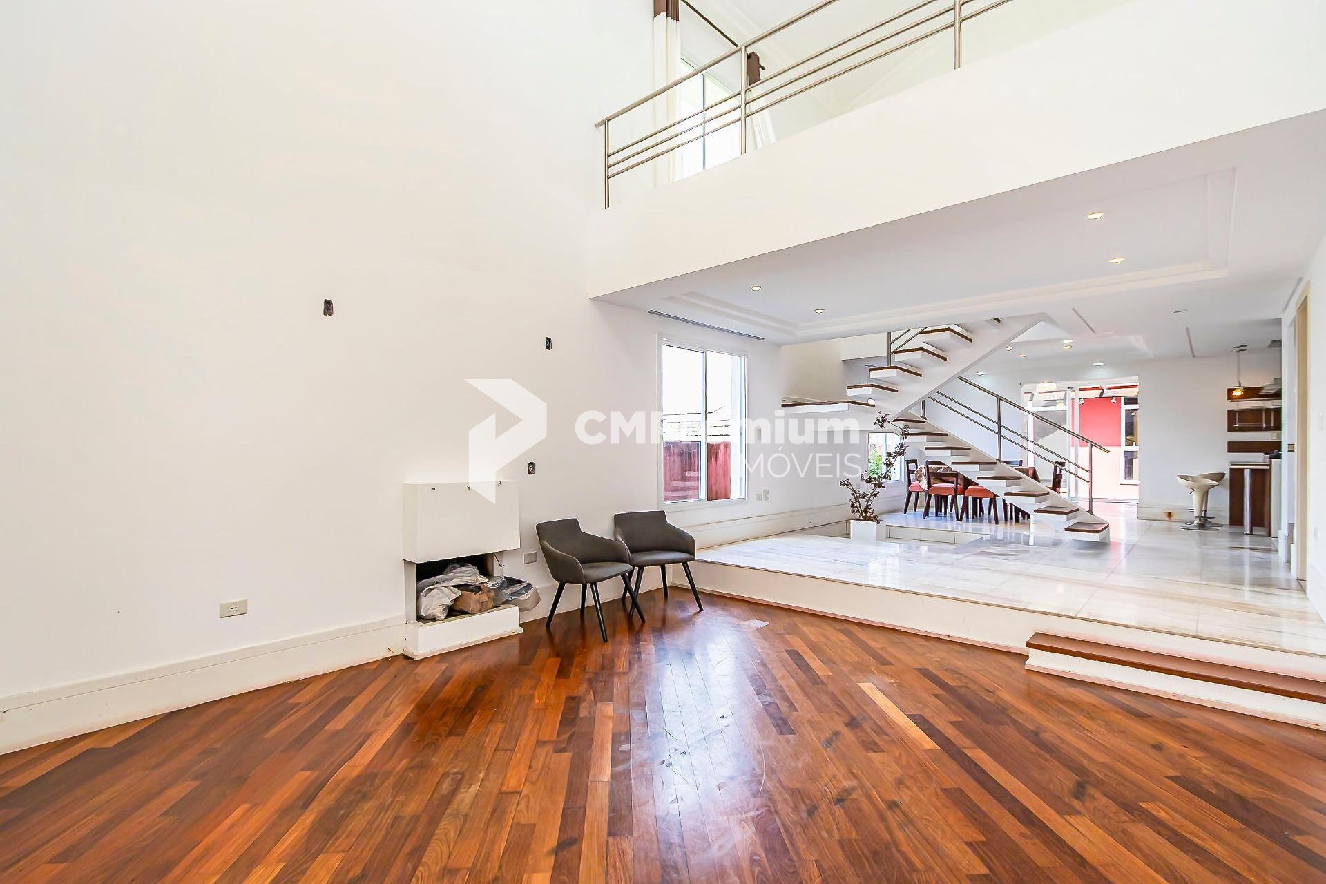 Sala de estar imponente com pé-direito duplo e sala de jantar aconchegante com lareira;