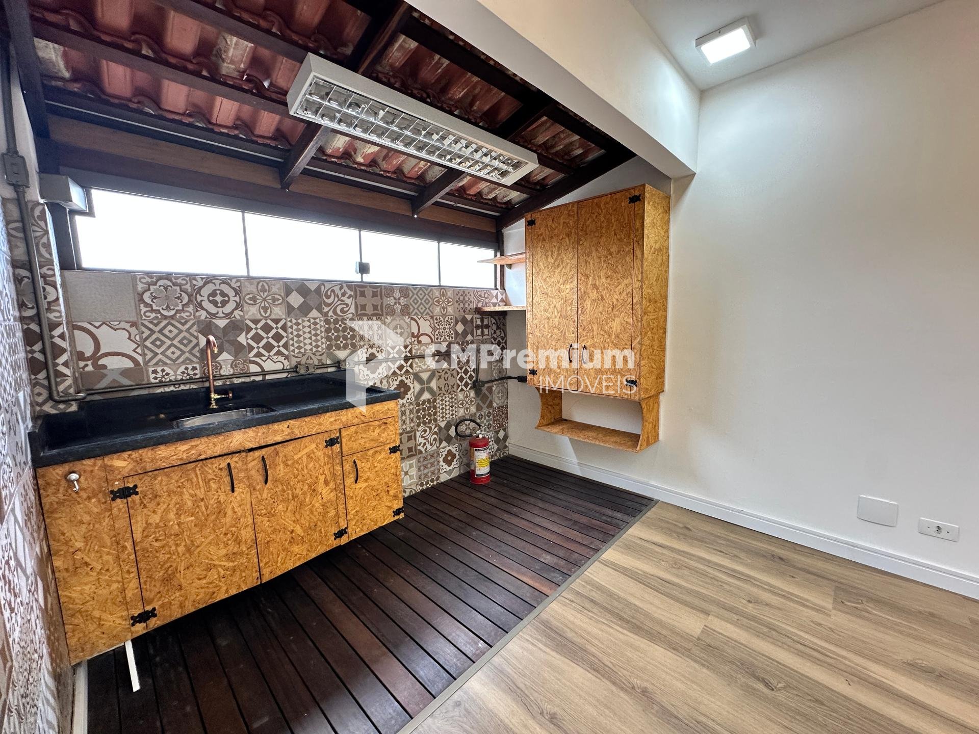 Cozinha com acabamento rústico;