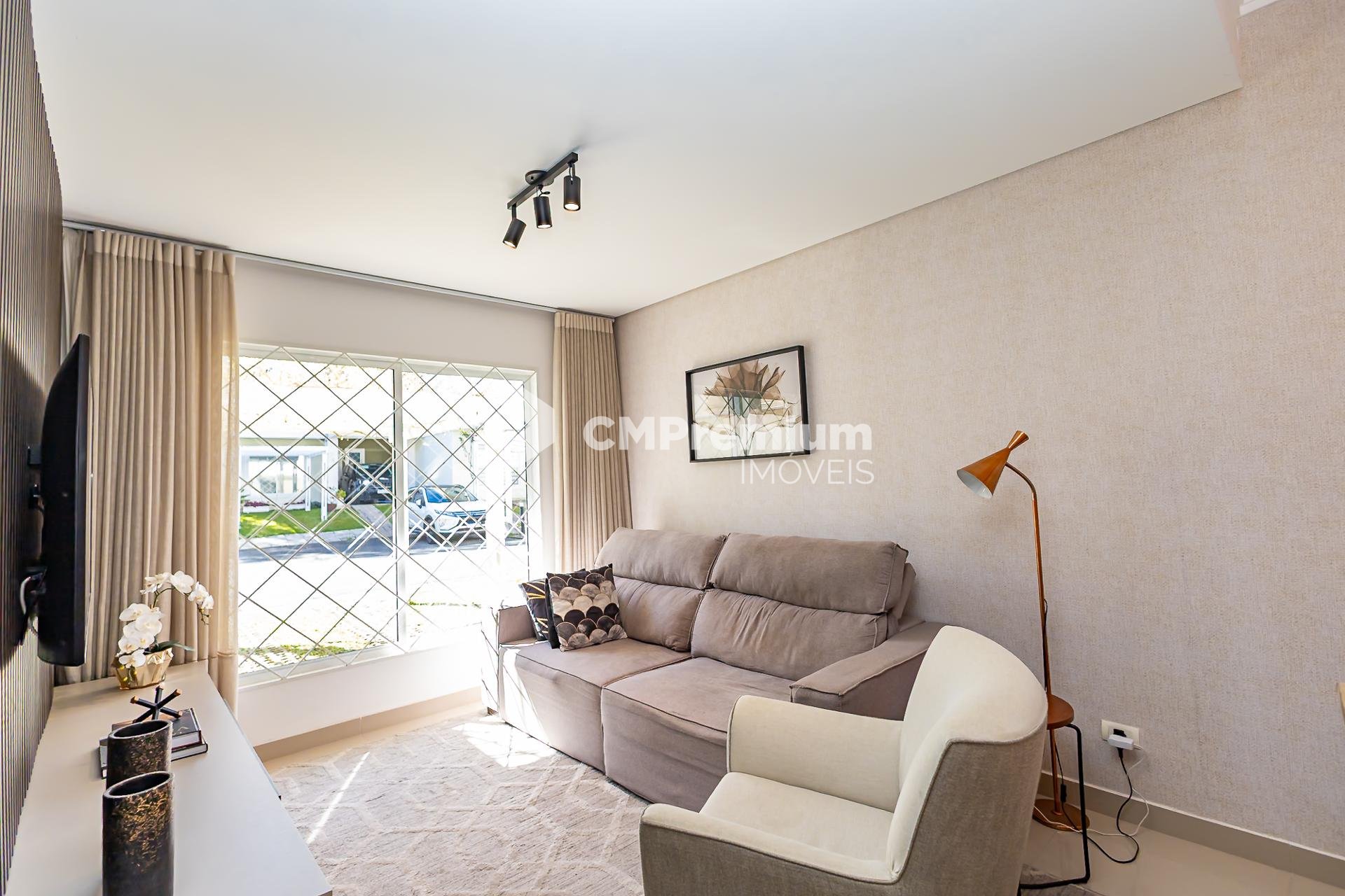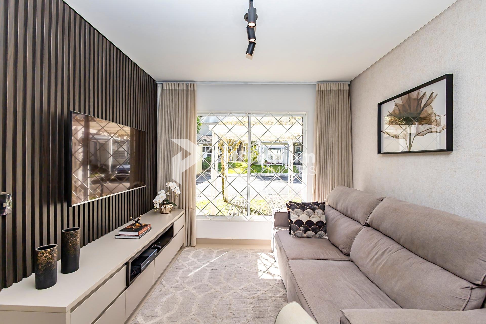 -Sala de estar com painel de TV e rack