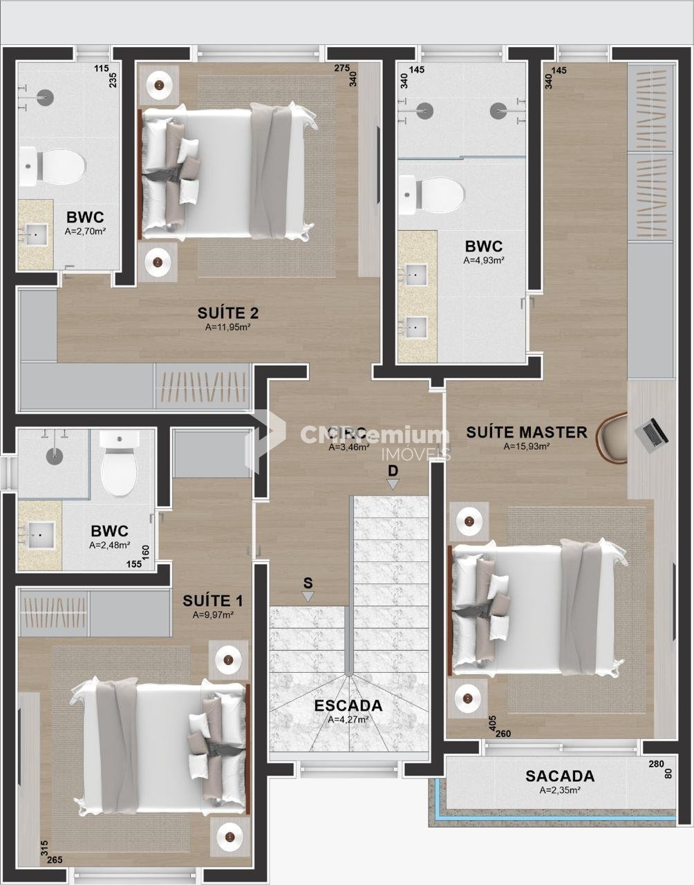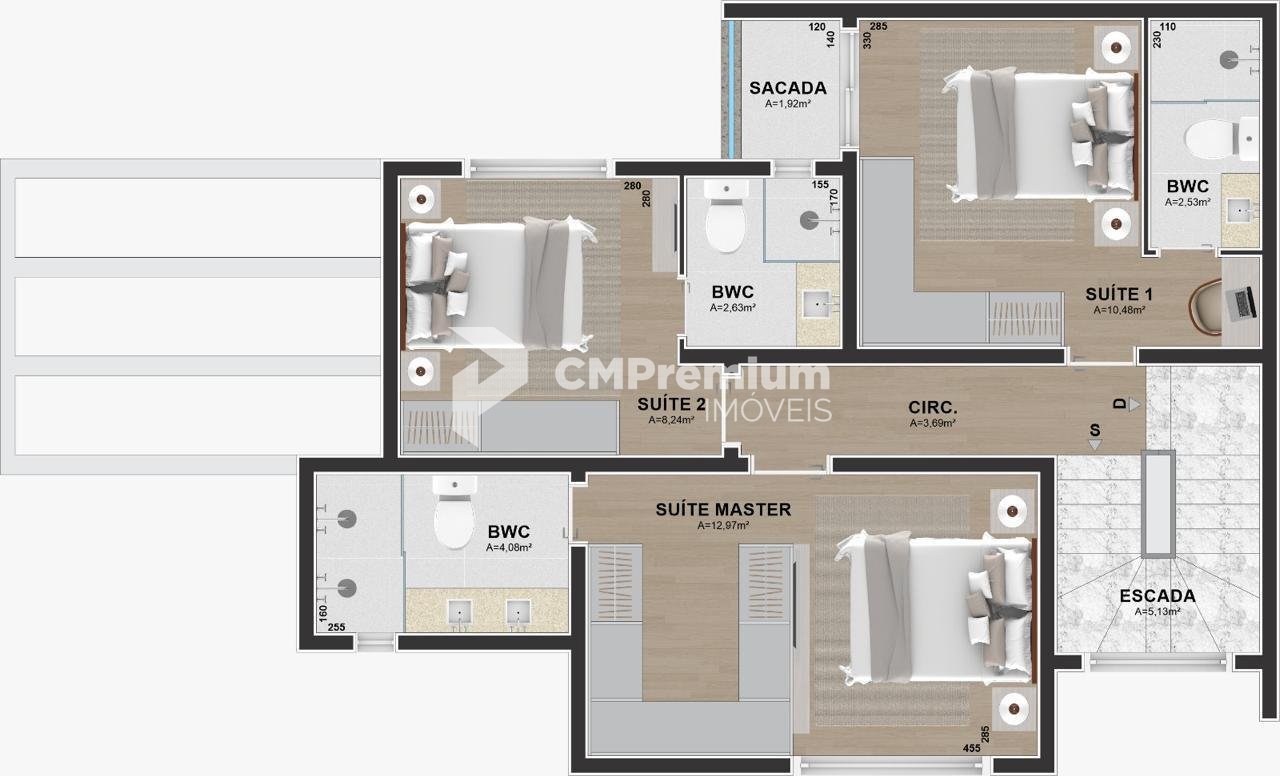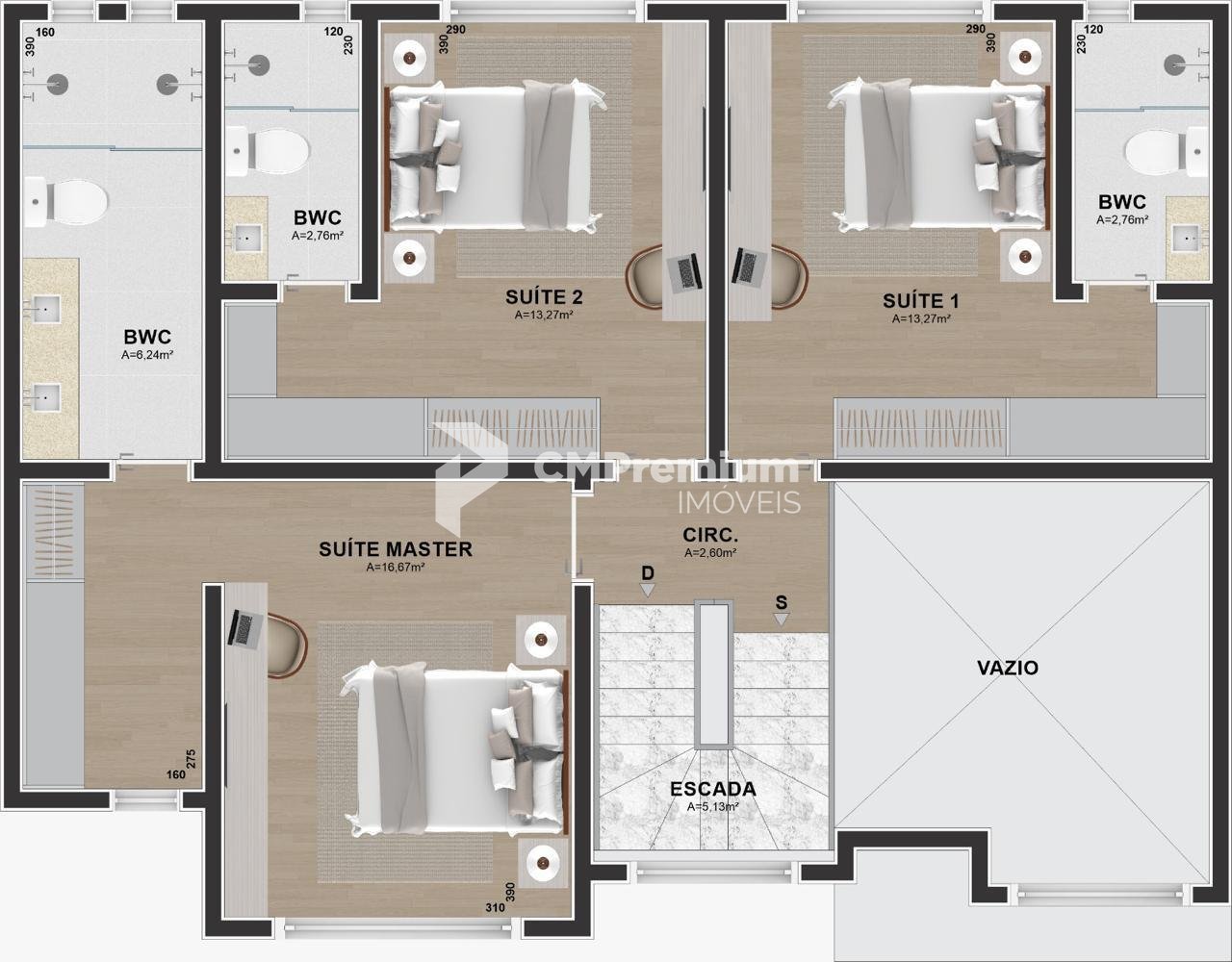 - Acabamentos premium com quartzo branco nas escadas