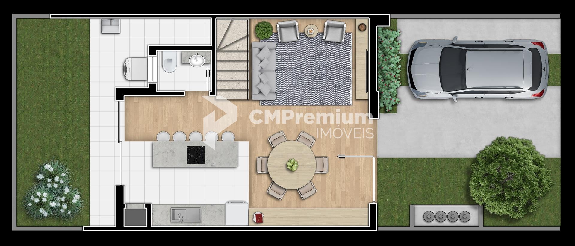 sala estar, jantar integradas com cozinha gourmet; quintal em grama com churrsqueira e lavanderia