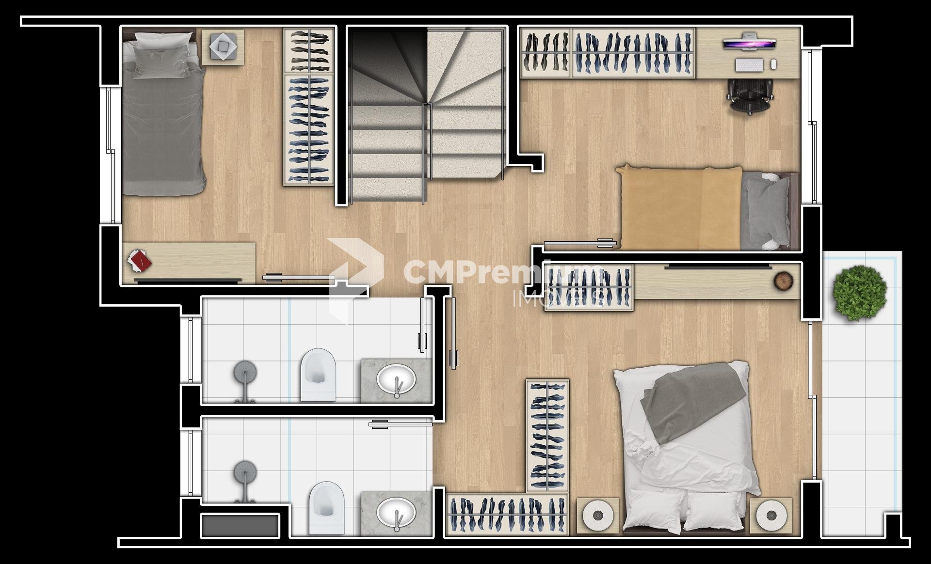 Segundo pavimento com 3 quartos, sendo 1 suíte com closet
