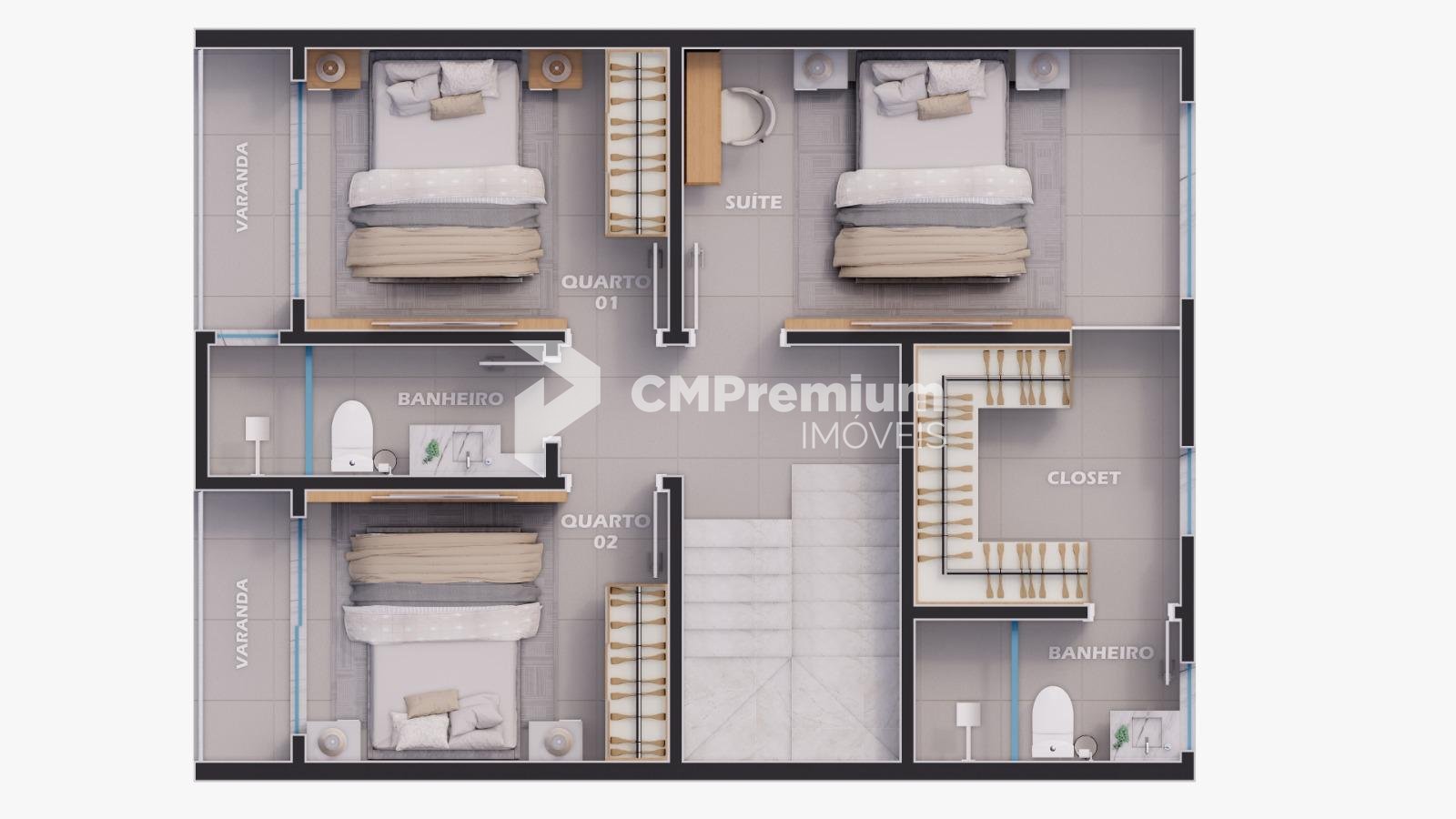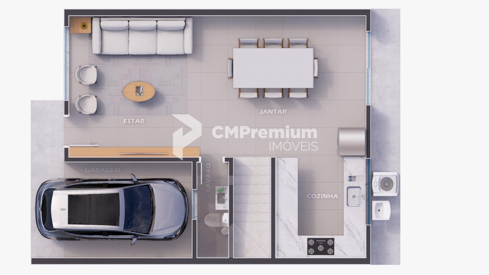 - Sobrado 01 possui: 3 quartos, sendo 1 suíte, 2 vagas de garagem, sendo 1 coberta e terraço com 44m².