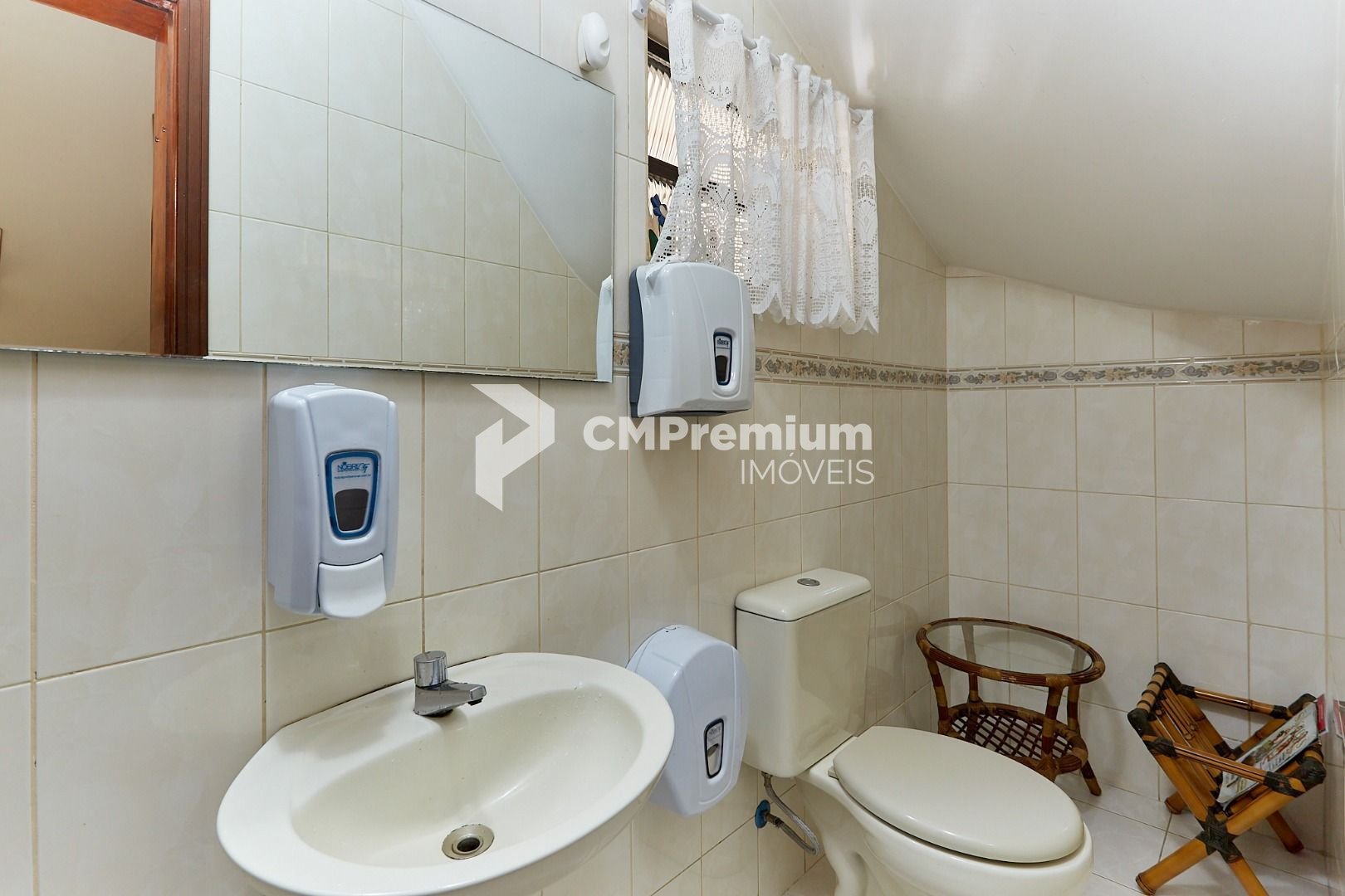 Banheiros: social no piso superior com box de vidro e lavabo no térreo.