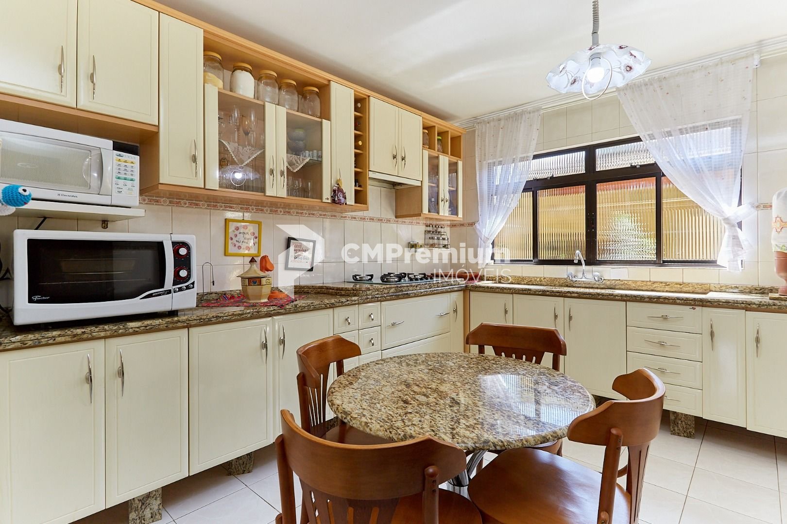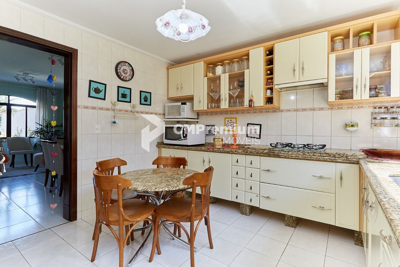 Cozinha com armários planejados e área de serviço bem ventilada.