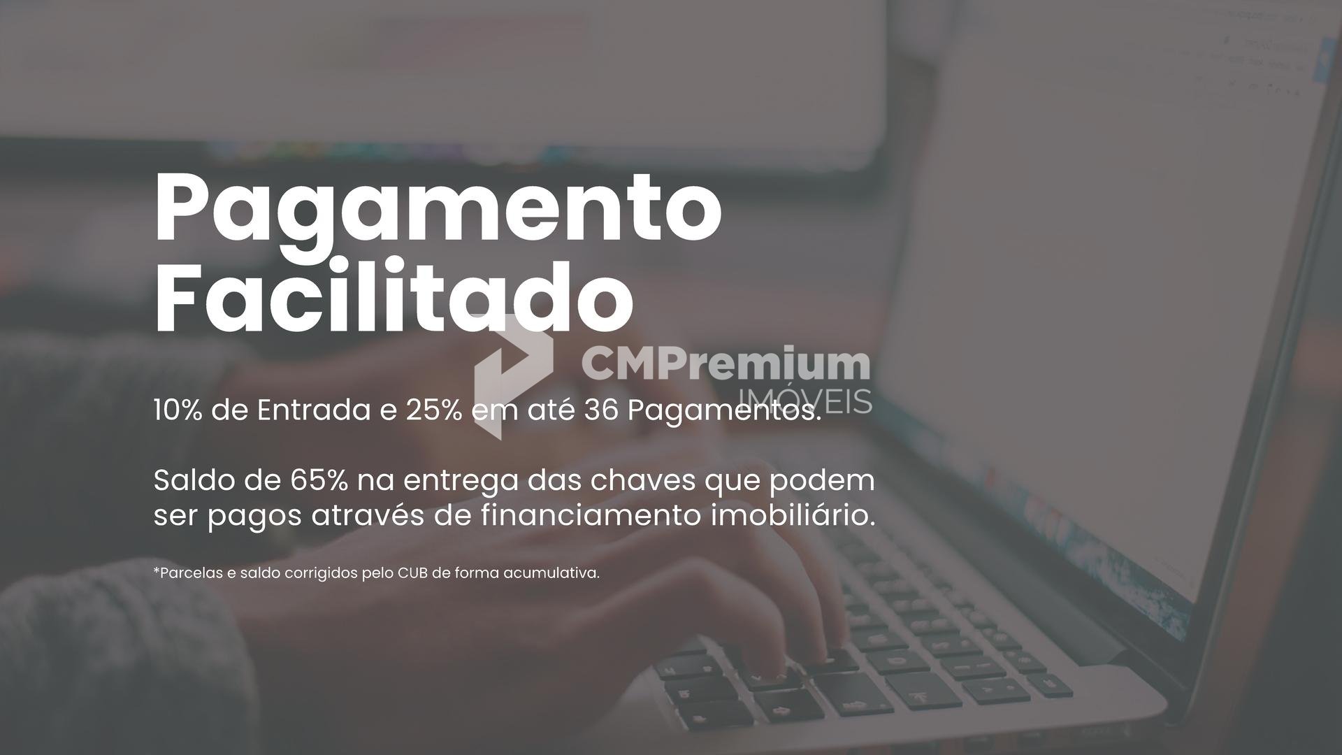 Saldo de 65% na entrega das chaves, que podem ser através de financiamento imobiliário. Parcelas e saldo serão corrigidos pelo CUB de forma cumulativa.