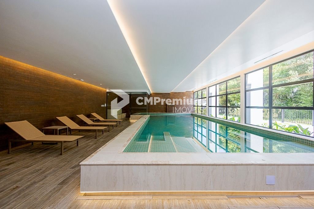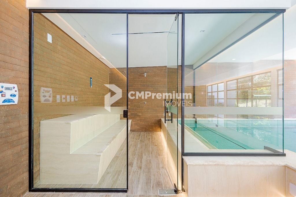 Spa com piscina aquecida, sauna úmida fechada em vidro com vista para o bosque.